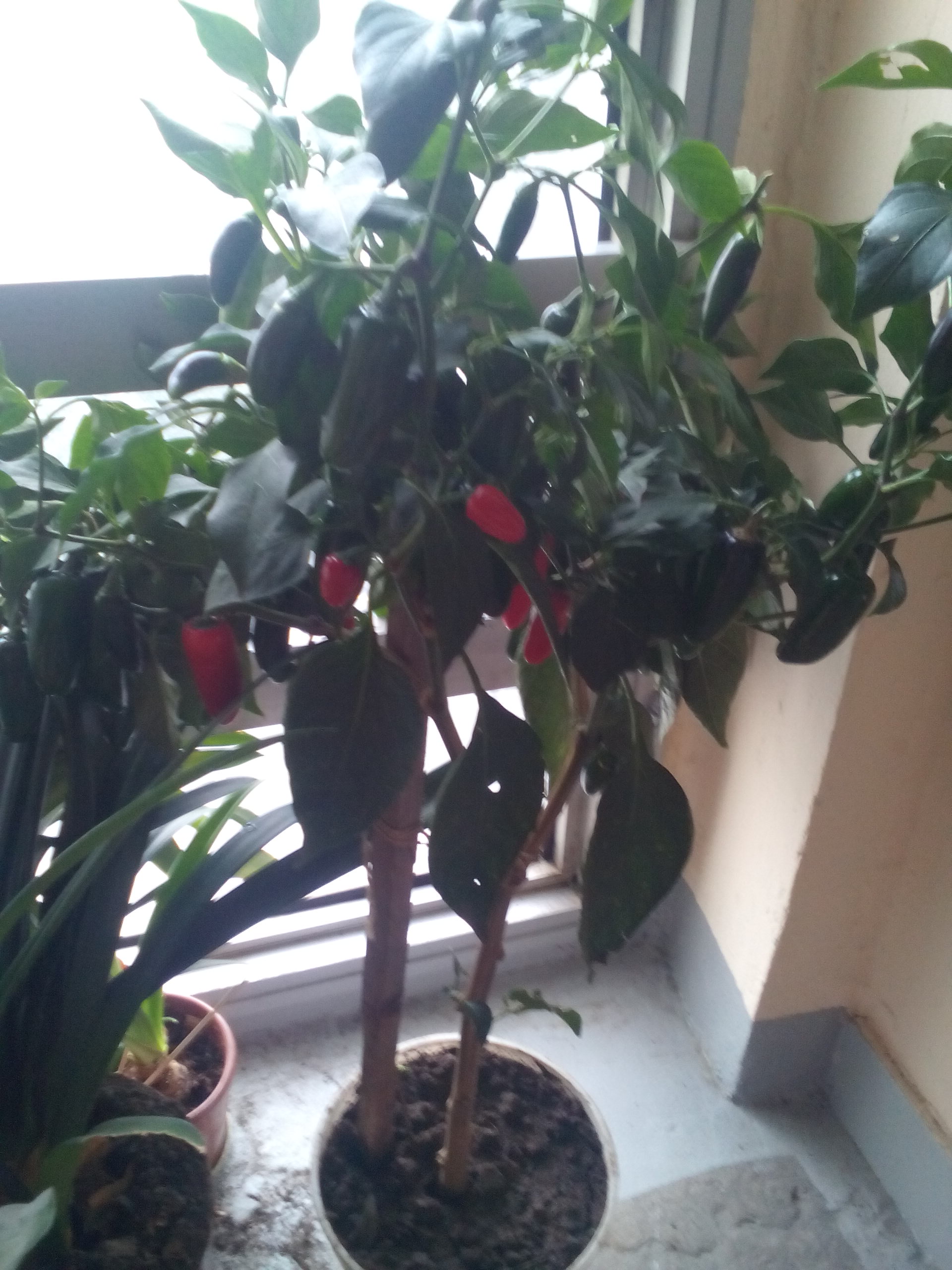 А это Сувенир. Пойдет уже на вторую зимовку на подоконнике. Обратите внимание на листья. Перец не только многолетнее растение, оно еще и вечнозеленое, листья не опадают. Вот этим листикам скоро будет два года, вид несколько бэушный, но ведь растение исправно цветет и плодоносит без перерыва. Сами перчики острые и их много.