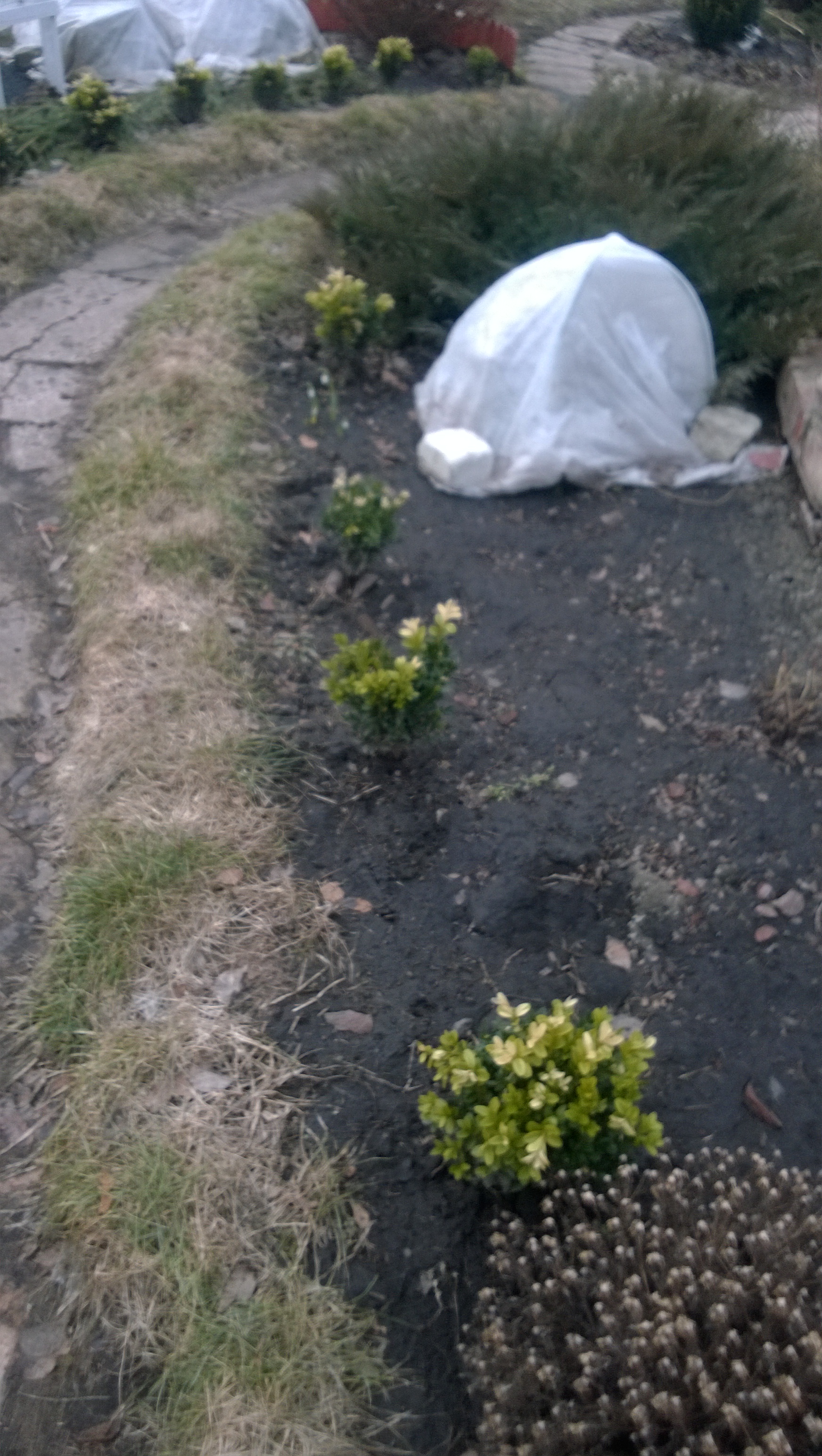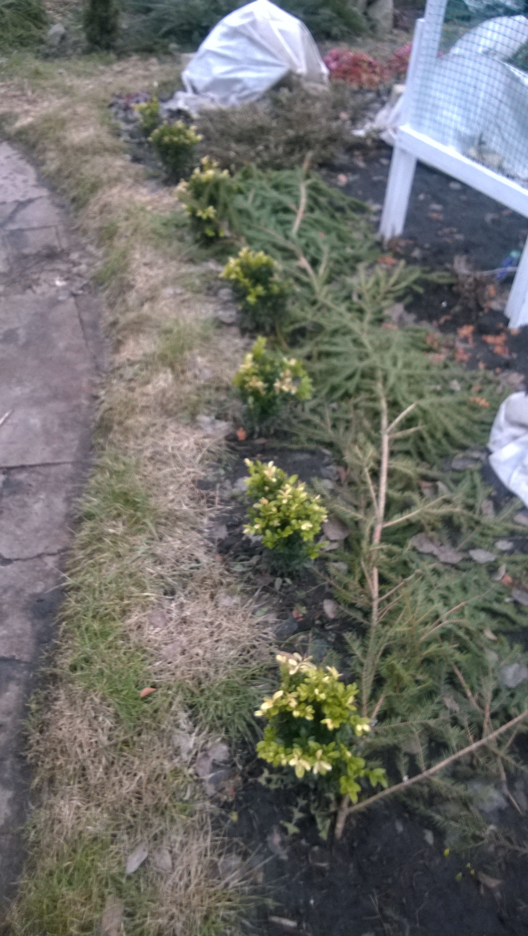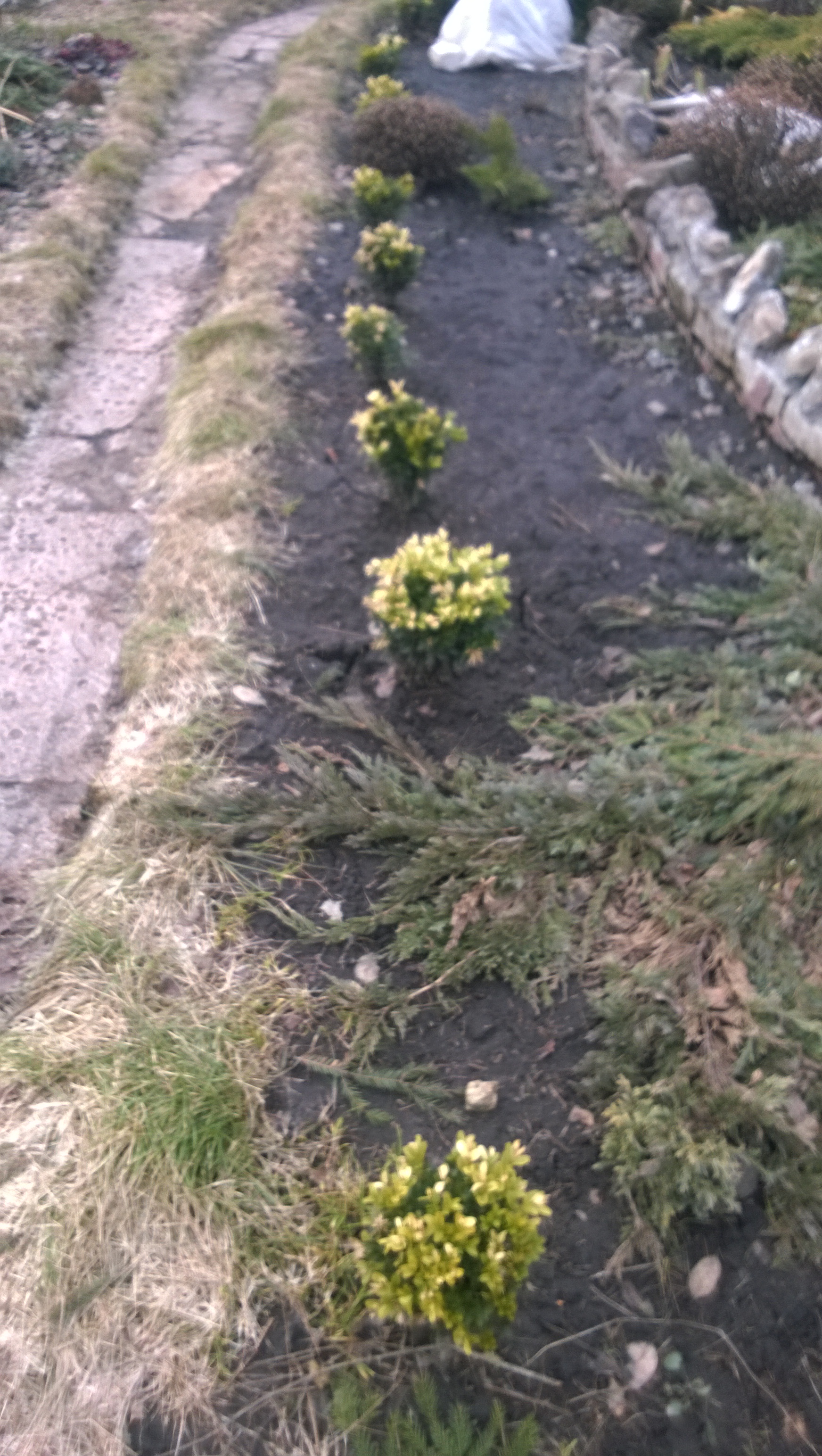 Я говорила о барбарисе, он ведь уже растёт... Разве мы ведём речь не об этом месте, где за кизильником растёт жёлтолистный барбарис? Ну, он слегка зеленоват, но всё же жёлтый. Или это не так? Хотя там уже растёт какой-то кустик, похожий на самшит... Может уже и хватит.