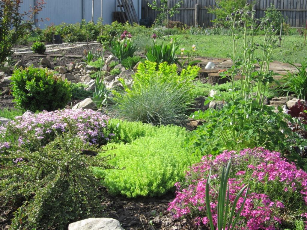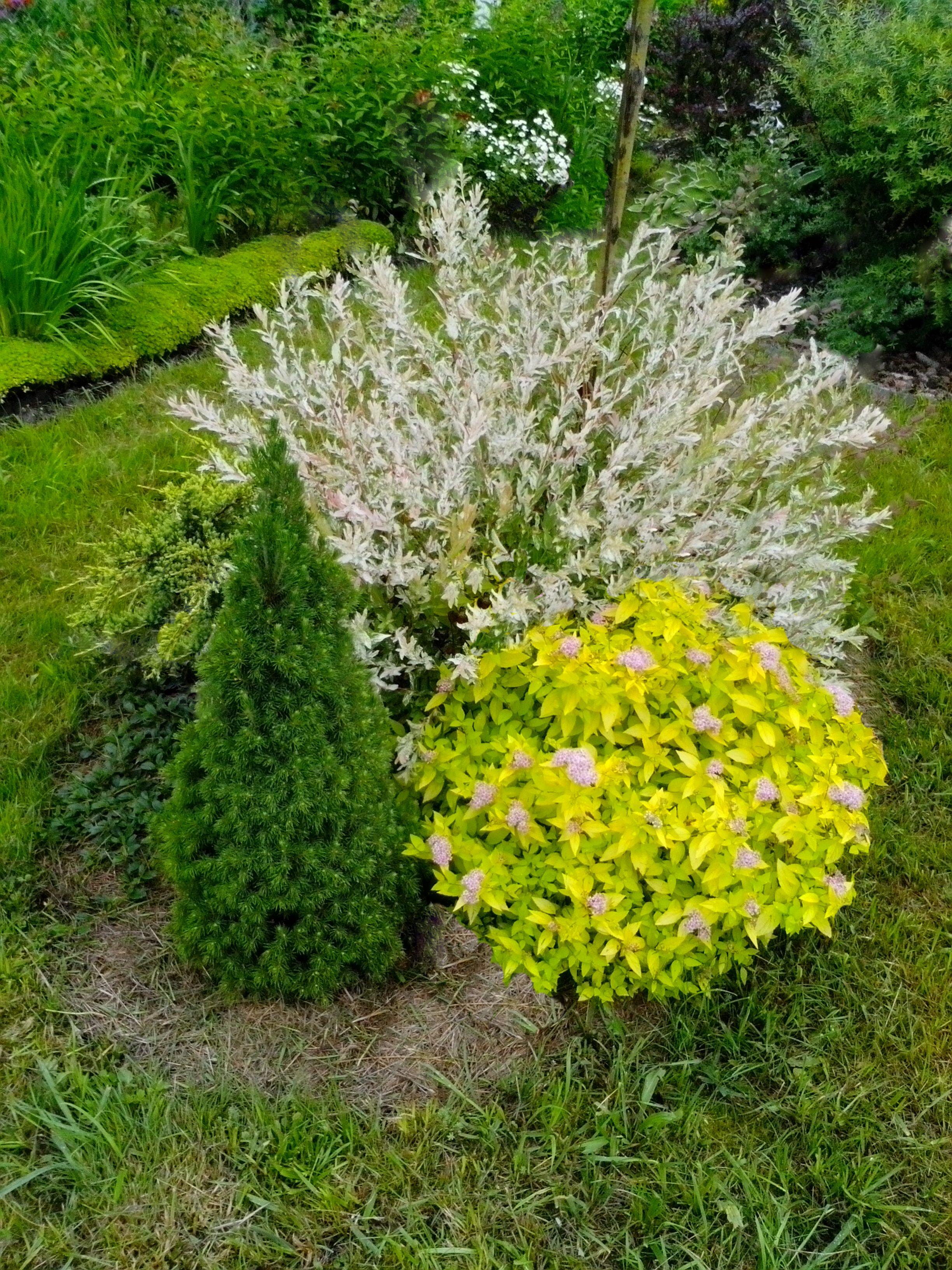 За жёлтой стеной посажены голубоватые скальные можжевельники - они будут выше кустов. Правее пересажу ёлочку Glauca Кaibab (она будет 10м высоты).