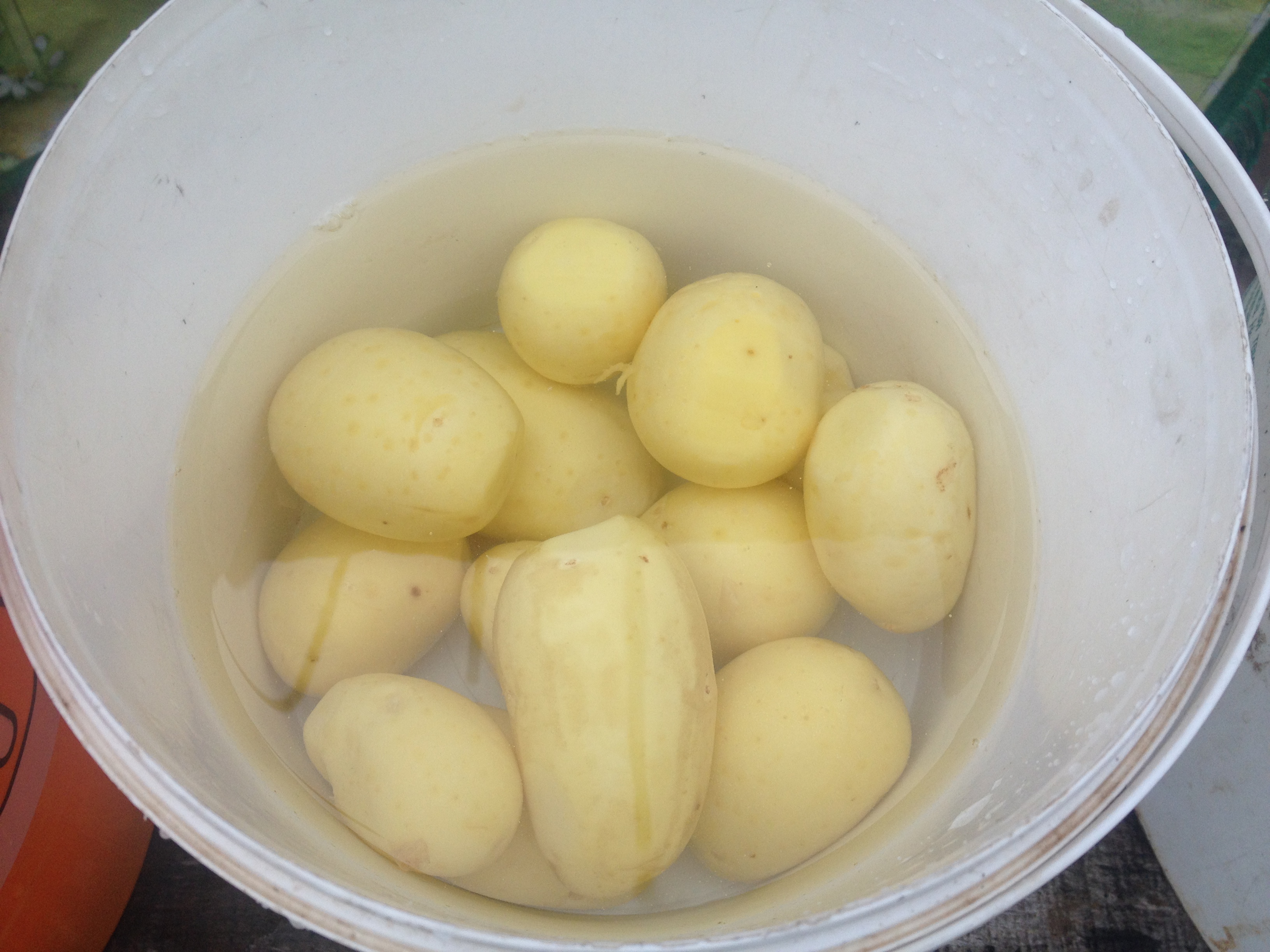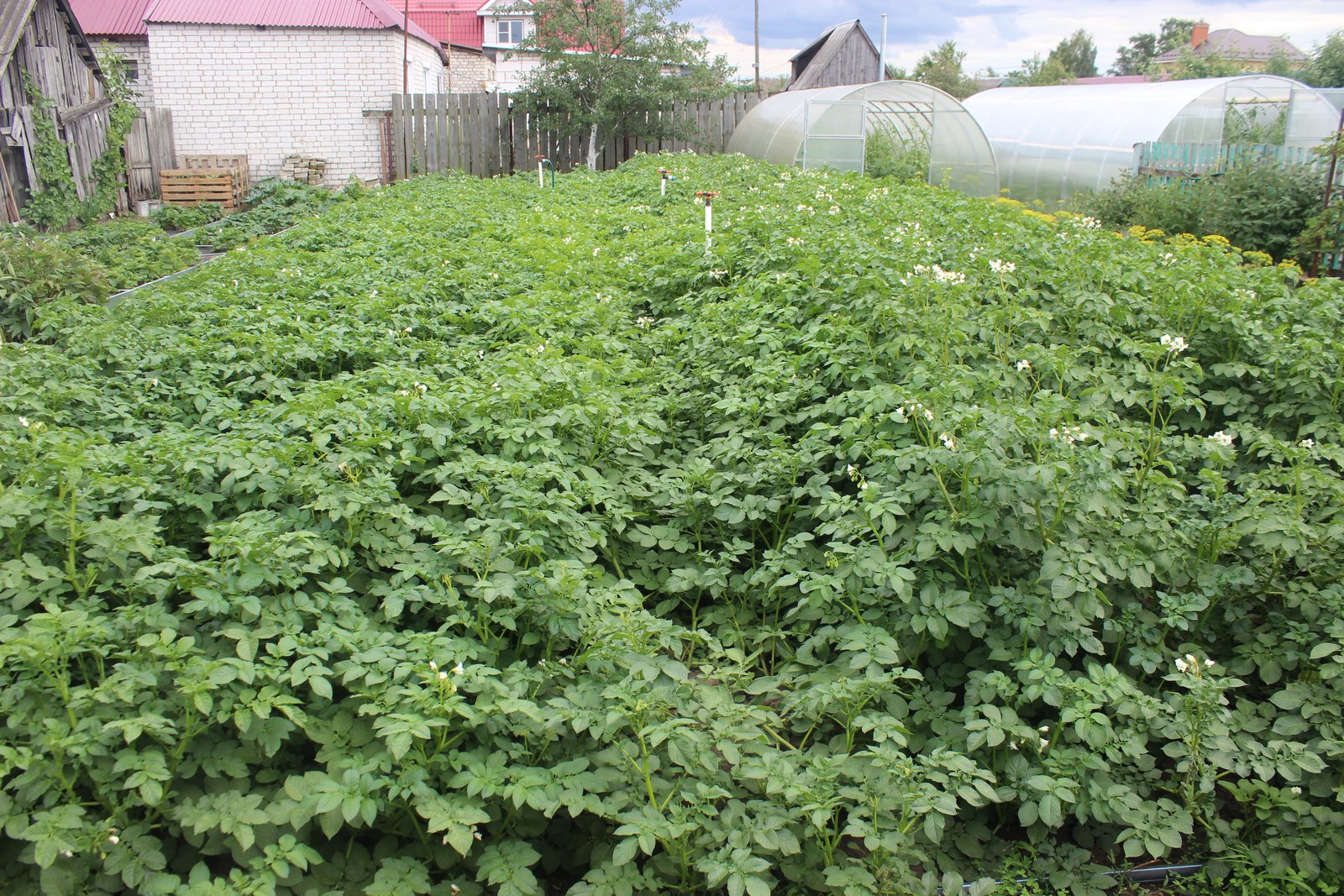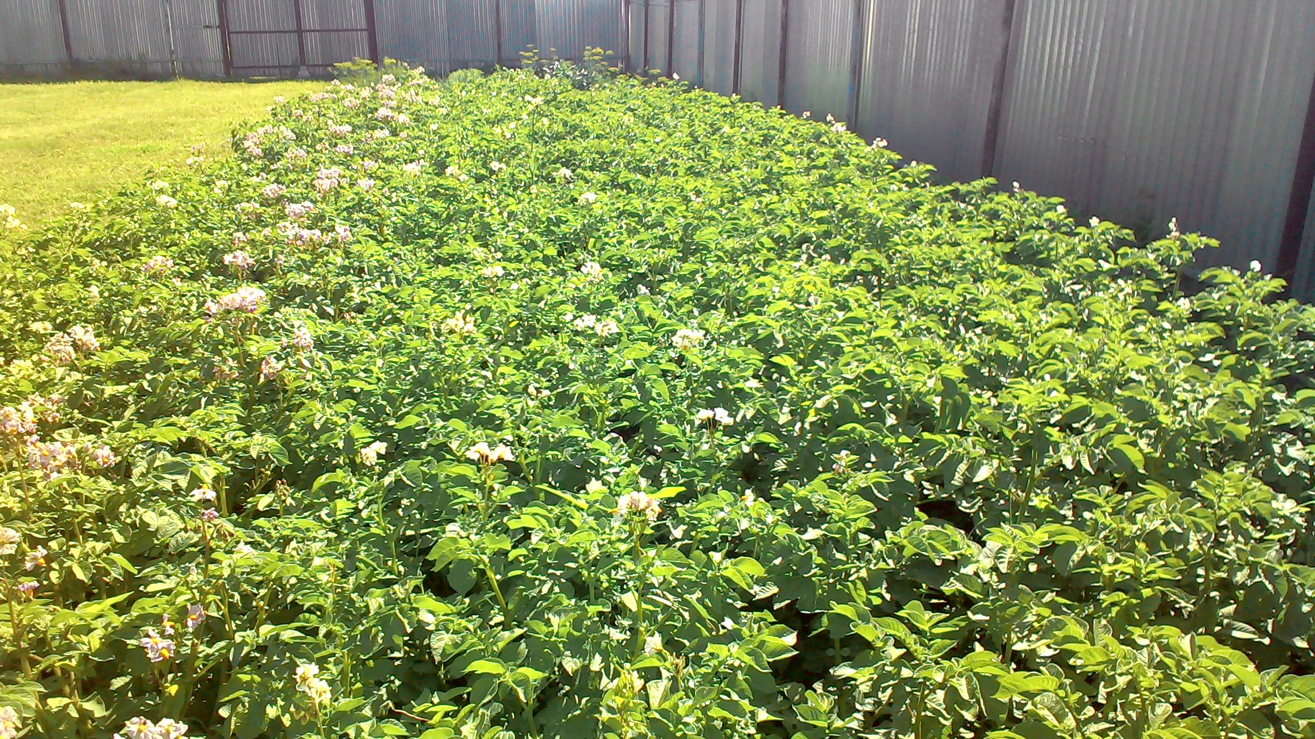 Картошка Витессе. Пришлось удалить 10 кустов вдоль огурцов, потому что плетям не хватало места, вернее, место огурцам есть, а мне при сборе урожая ногу поставить некуда. Сзади картошка в филейную часть упирается, спереди огурцовые джунгли. Картофельная ботва была ещё местами с цветами, но клубни навязались прилично. В некоторых кустах килограмма по полтора было. К уборке ожидаю приличного урожая. Но это только на небольшом участке (сотка), остальная в мае засохла, в июне замокла, в июле её какие-то вредители почикали, и копать-то не хочется. Впервые за несколько лет ботва между рядками не сомкнулась вообще. Всё равно врагу не сдаётся наш гордый Варяг :D