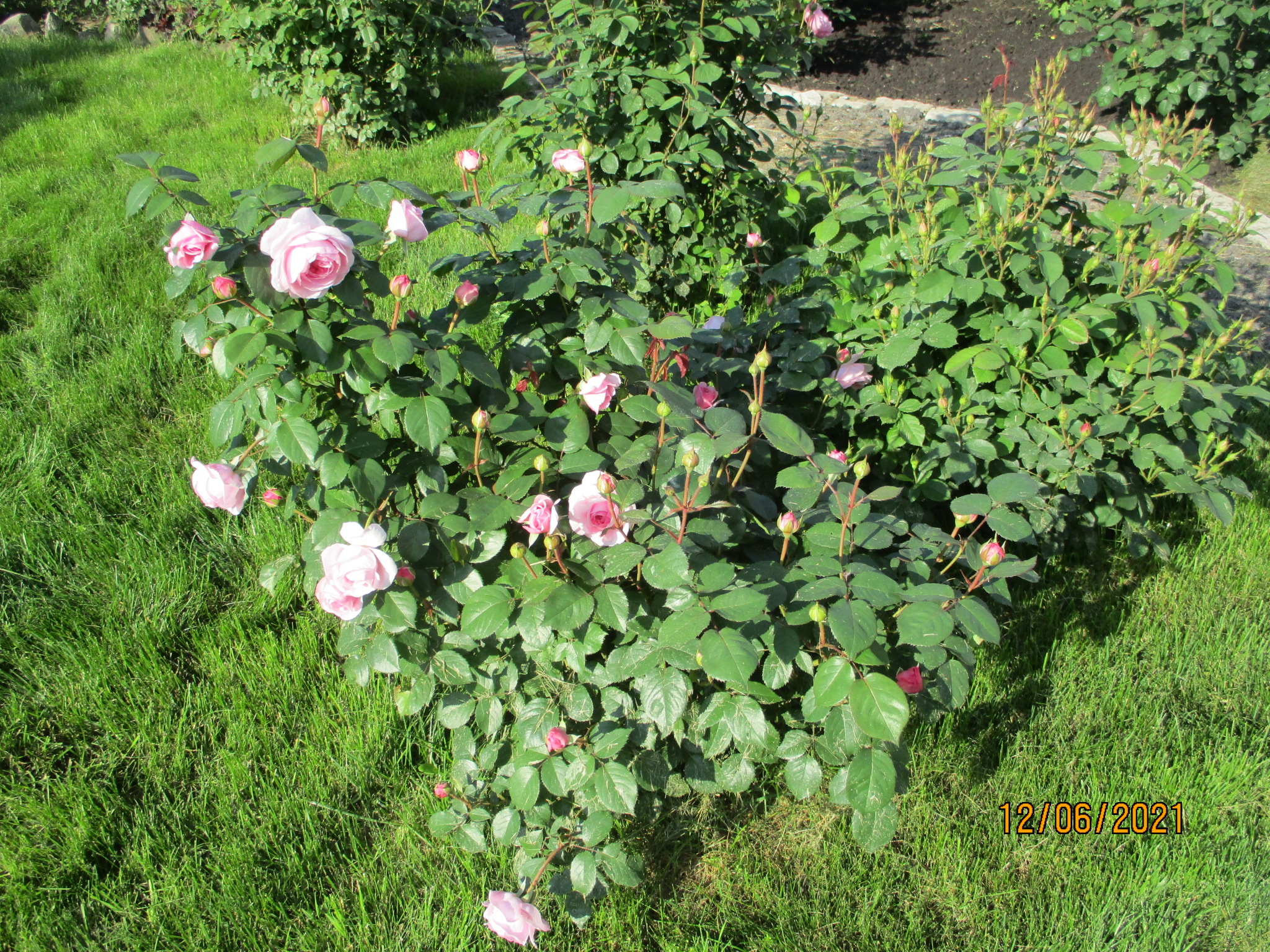 Ириш,вот не знаю,почему я не сняла на фото эту троицу вместе цветущими.В центре роза с полумахровым розовым цветком(на первом фото она еще в бутонах),а по бокам махровые.Все остинки. На газоне. Может представишь :oops: .