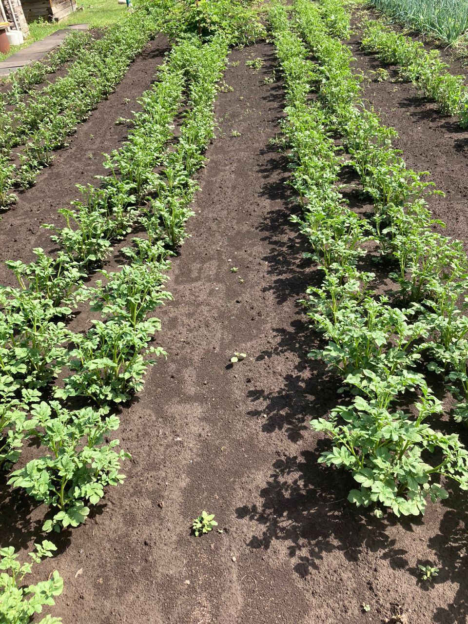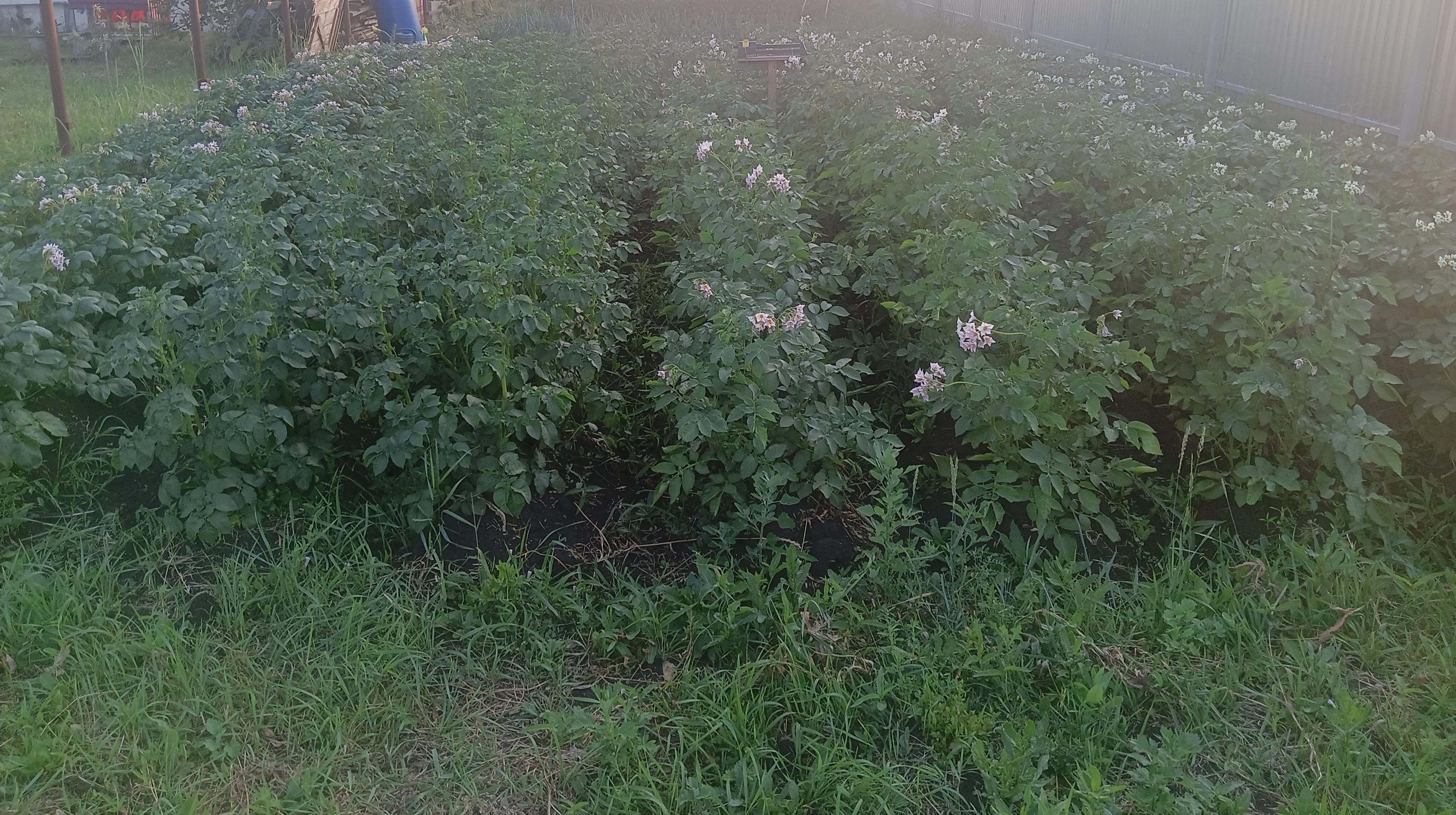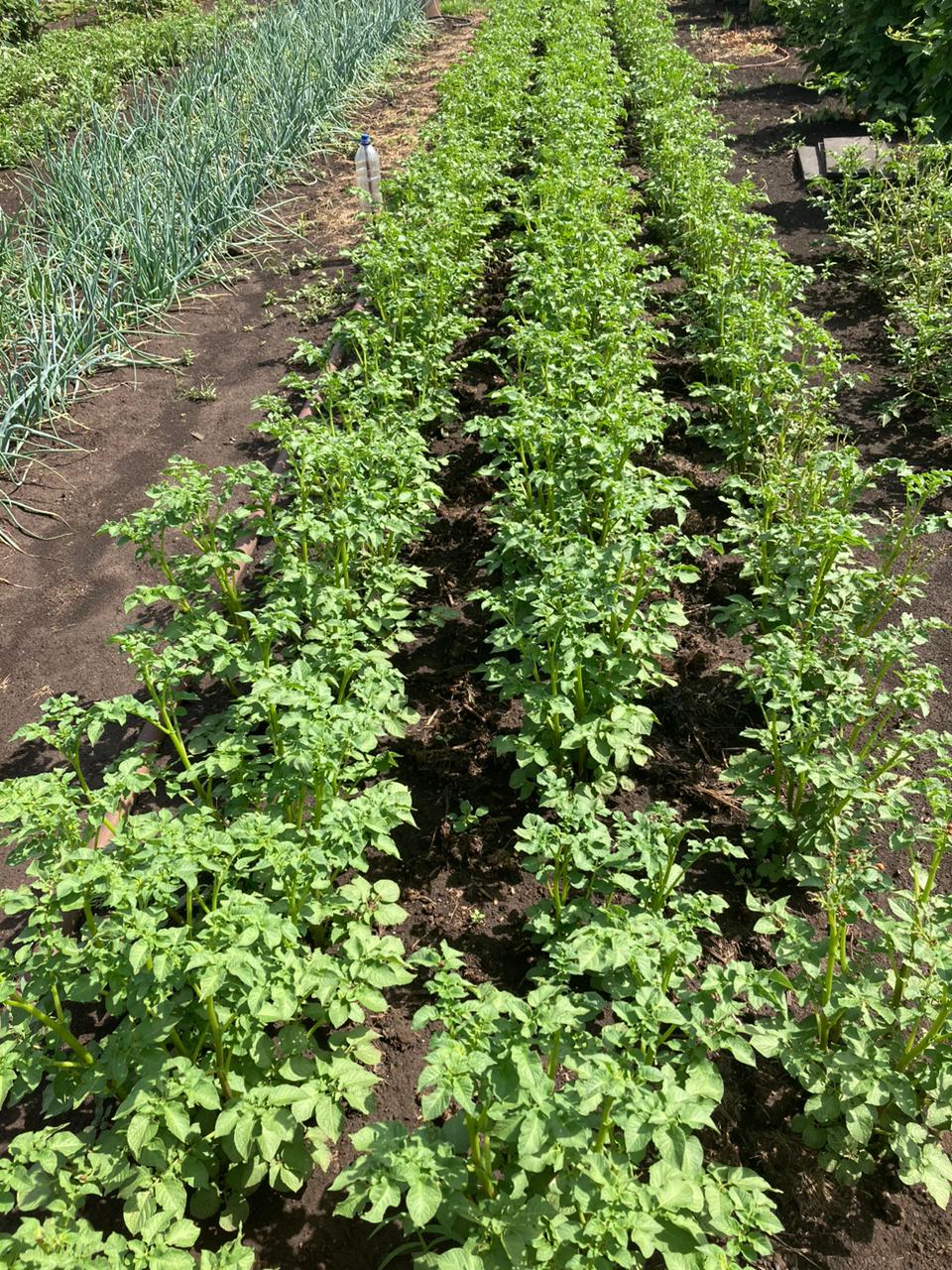 Слева направо Фламинго (2 ряда), Михайловский(2), Кумач(3), Азарт(2). У нас полтора месяца была засуха, был один только дождь, сейчас пришел фронт и начался второй. При первом окучивании земля была как асфальт, пришлось междурядья культиватором проходить. Но картошка выглядит неплохо.