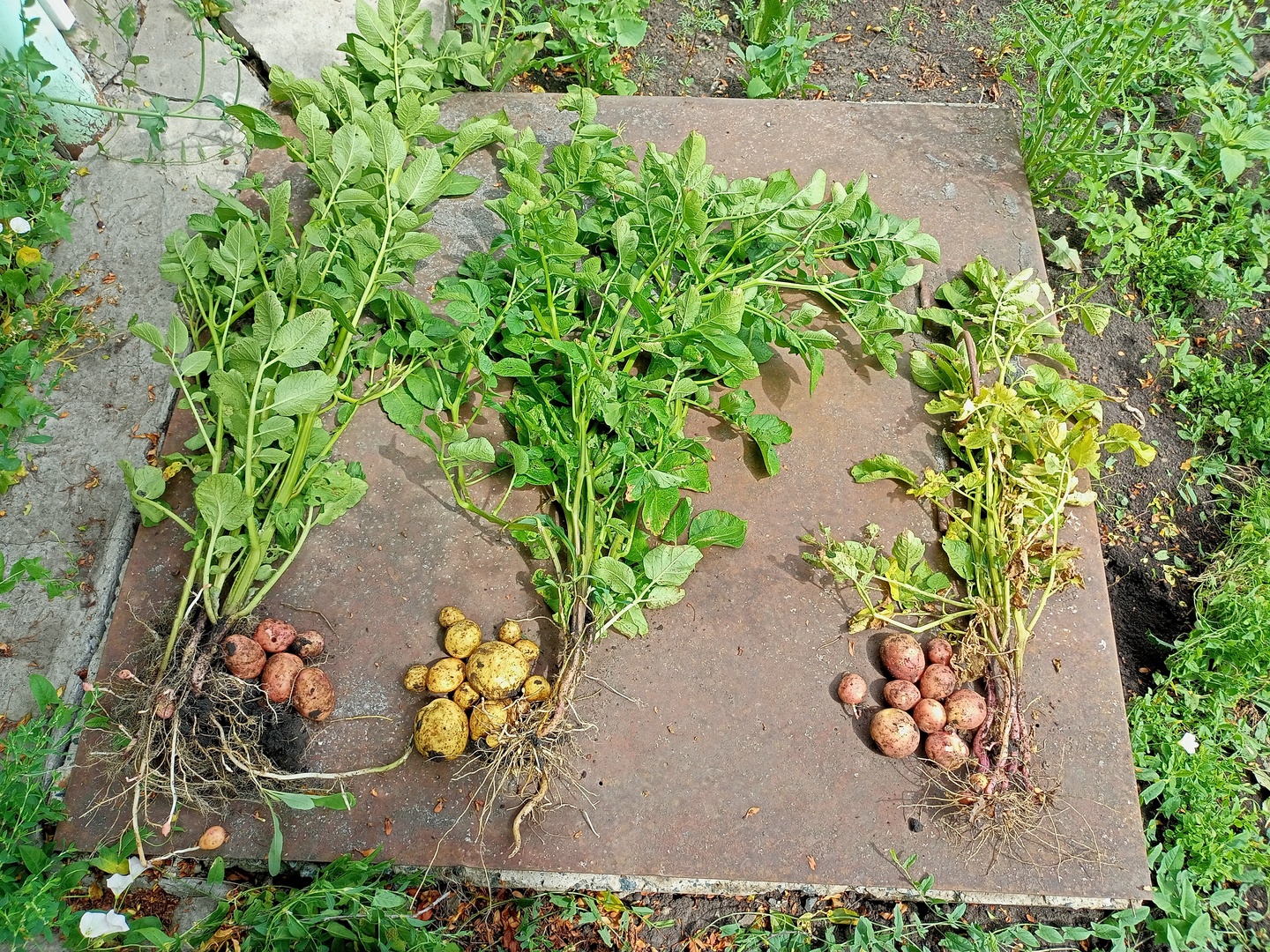 Сегодня попробовал копнуть на том участке, что сажался 14 апреля. Там уже в районе 60 дней от всходов прошло, но всё равно мелковата картошка. Справа Рэд соня, ботва начала сохнуть, а размер не набрала. В том году вроде нормальный урожай был с неё, непонятно что произошло. По фото непонятно, самый крупный клубень у неё со спичечный коробок.