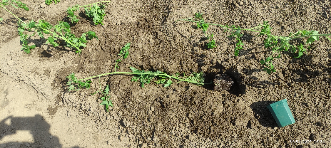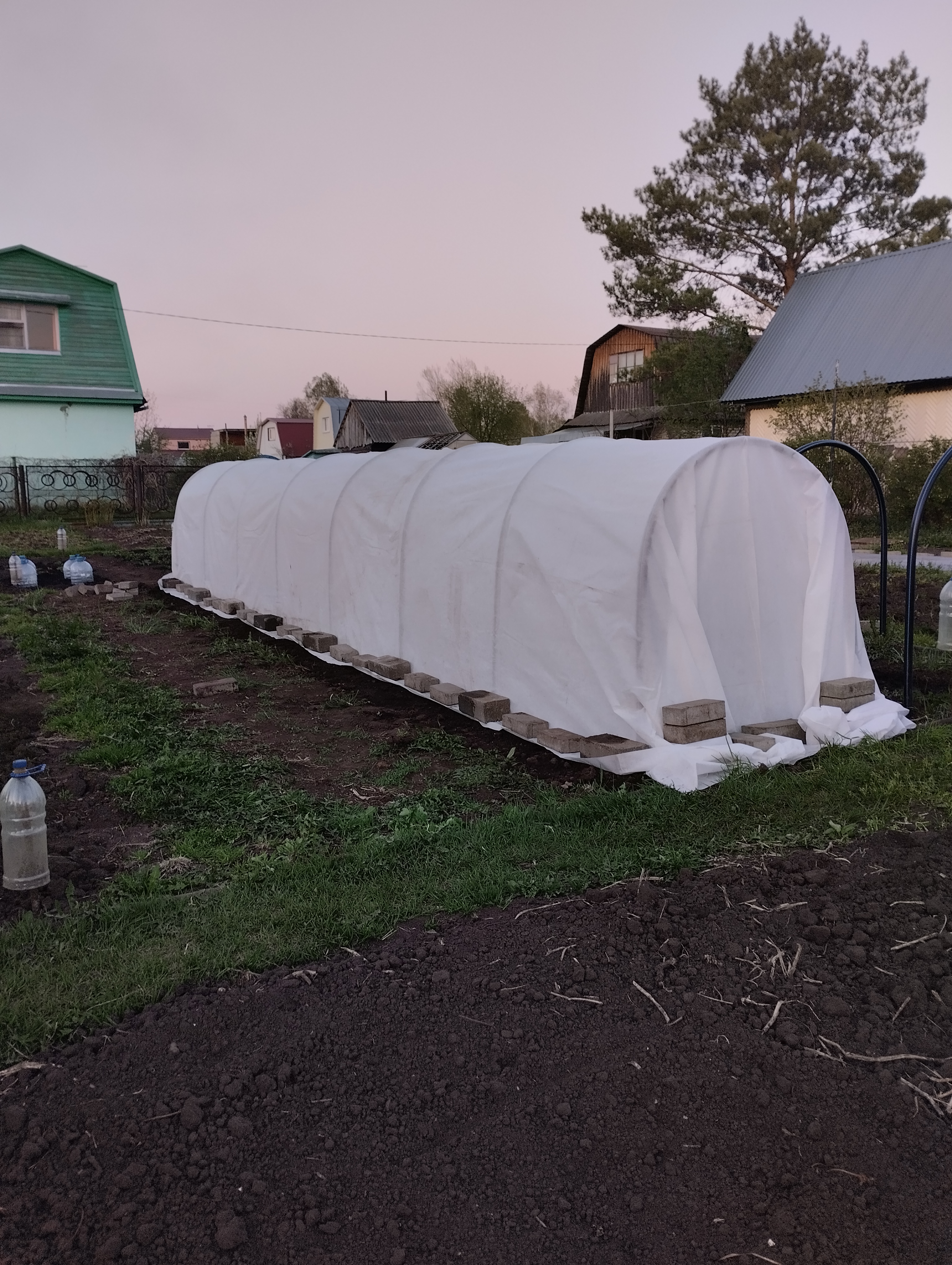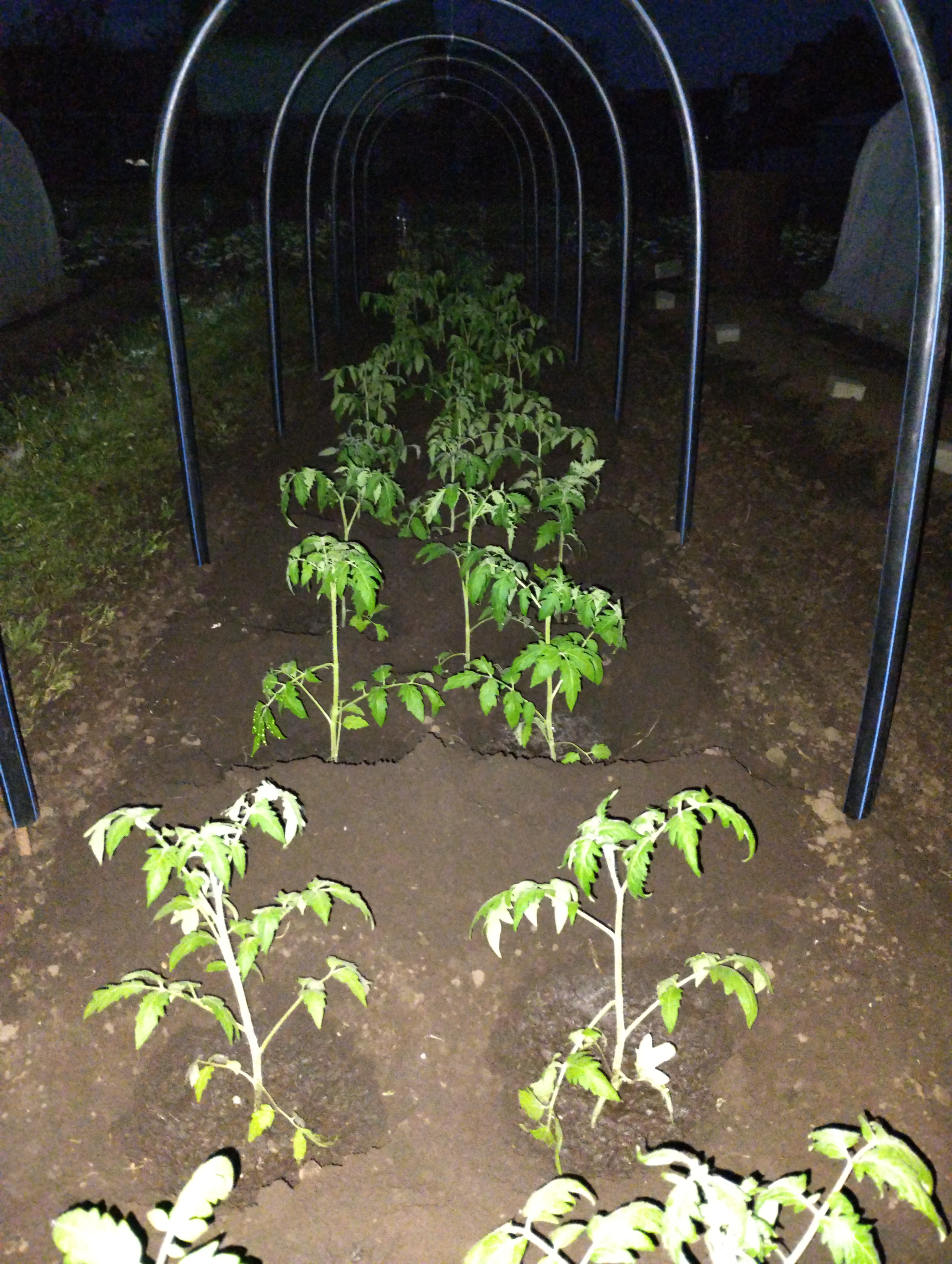 Высадил в открытый грунт примерно 40 шт. томатов сортов Белый налив и Агата (семена 365 дней из ленты). При высадке растения перемешались - отследить где , какой сорт будет невозможно. ВВиду затяжной весны и недостатка света в кваритре рассада вытянулась (0,8 - 1,0 м)- высаживал горизональным методом - корни все переплетутся - будет единый томатный синдикат. ВВиду дефицита места высадил слишком плотно - 35Х45 см. (в случае необходимости потом половину вырежу). В прошлом с томатами было всегда плохо, посмотрим что будет в этом году. Посадки накрыли дугами и нетканым материалом типа спабонда.