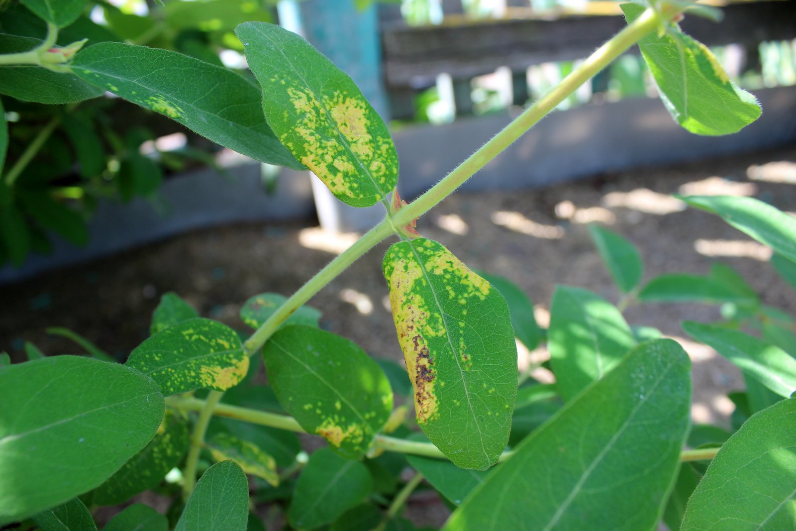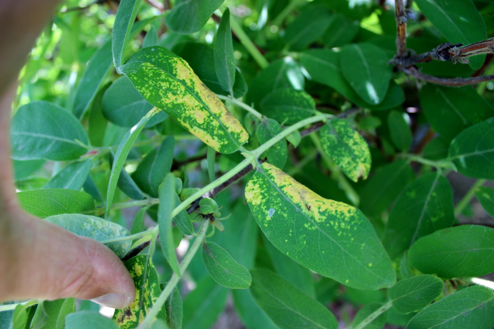 Вот, я как раз наделала фото таких же листьев на своих жимолостях, практически на всех - старых, новых, российских, канадских.