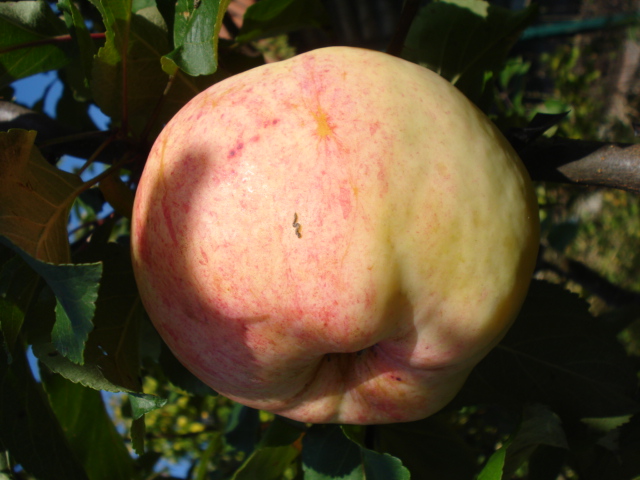 Но вырос неизвестный осенний сорт, с заявкой на неплохую лежкость. Плоды в основном крупные, самое большое было 412 гр., плодоножки почти совсем нет. Мякоть сочная, не твердая, но и не рыхлая. Вкус кисло-сладкий, гармоничный, на мой взгляд не меньше 4.5 балла. Семье нравится.