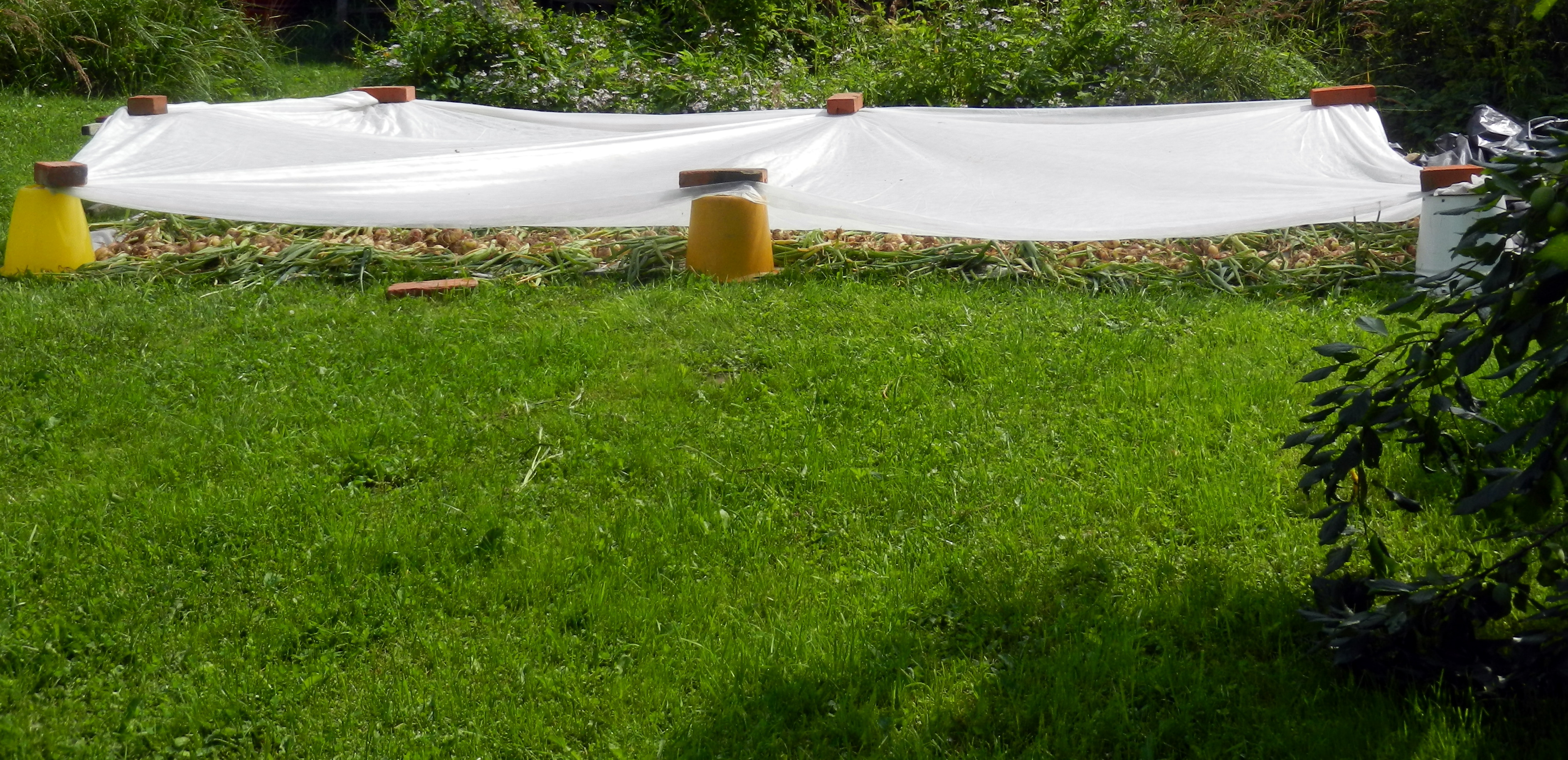 Мы на ночь и в дождичек его накрываем плёнкой, дел одна минута. А днём раскрываем, а сверху с просветом накрываем спанбондом (что бы солнышко лук не сварило), Сохнет хорошо и жарко и ветерком обдувает, дня через два первый раз зелёнку обрезаем, если погода хорошая дней за десять он у нас высыхает.
