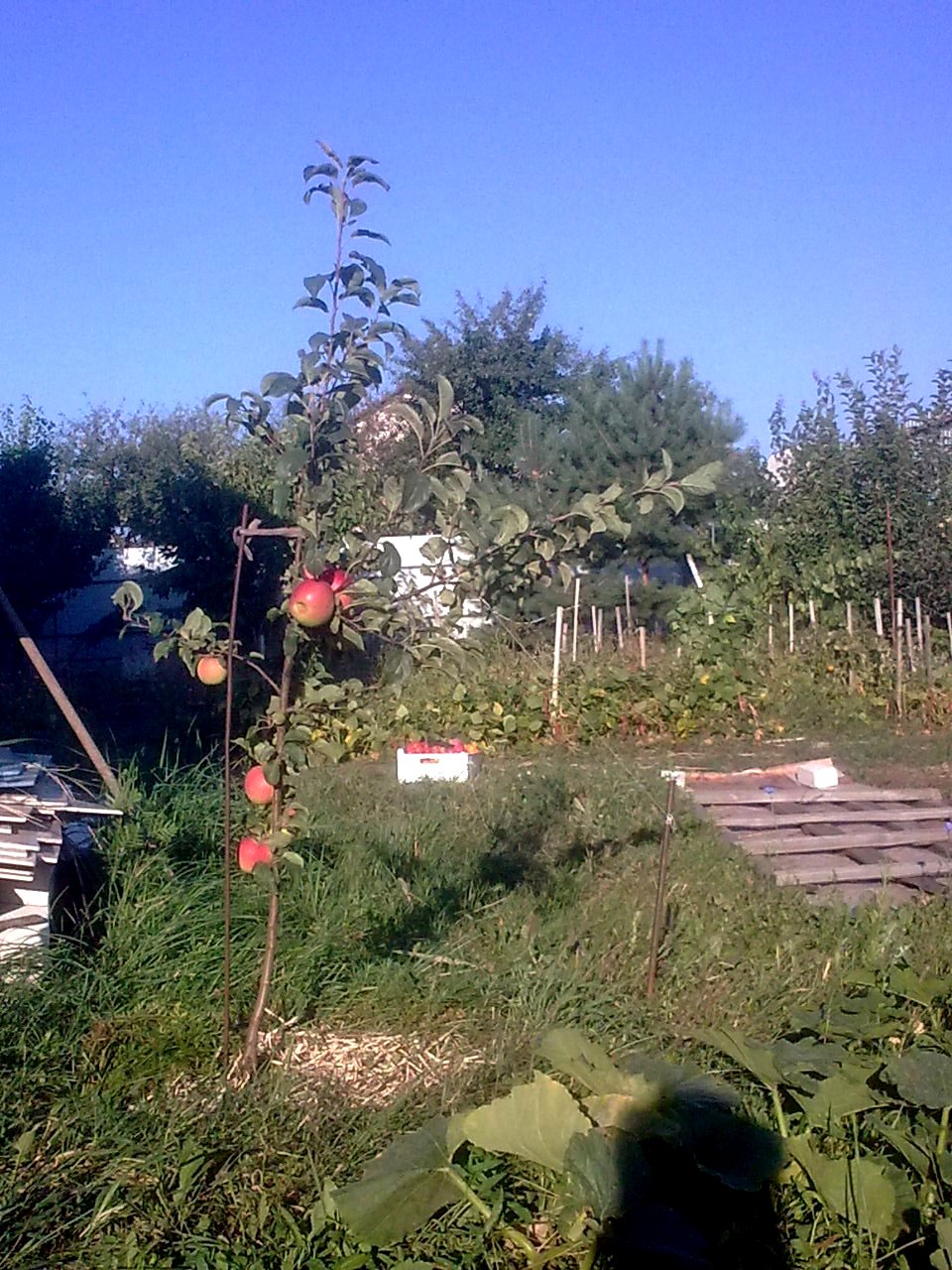 Бывает и такая нагрузка, Ханикрисп на ПБ/В9 на второй год вегетации после высадки (развитого) саженца (из питомника Старк в Миссури):Zener писал(а): Мне такой "фокус" удался со Скалой в прошлом сезоне,двухлетка на 62-396 выдала десяток полноценных товарных яблок,при этом прирост составил до 50 см.Но для этого пришлось еженедельно обильно поливать и раз в месяц кормить.
