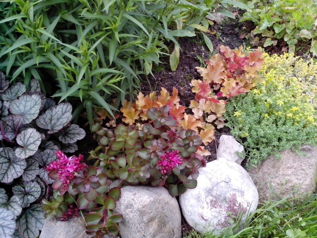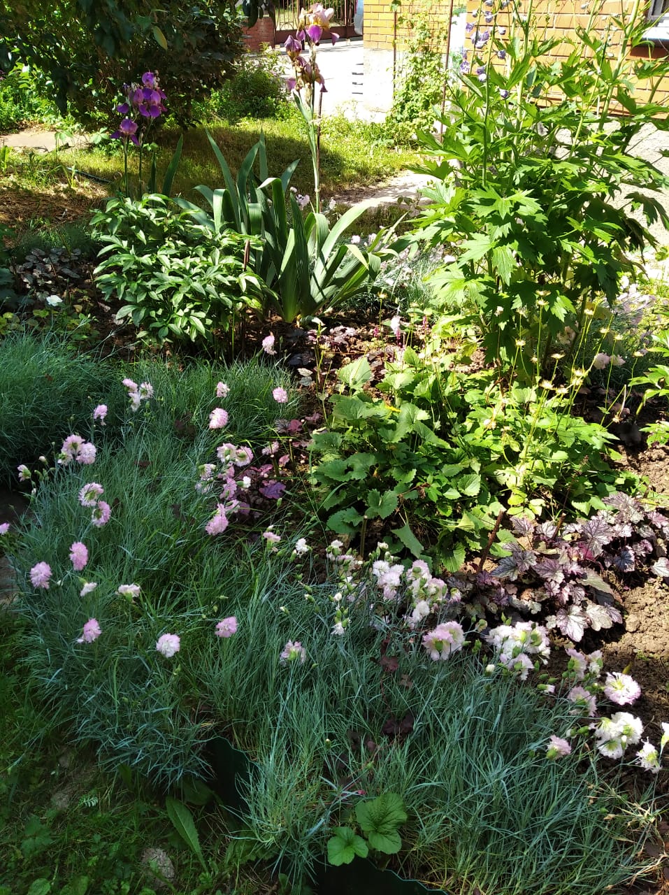 Ещё, вот так сходу... под вопросои ирис германский. Они точно любят солнышко, боятся гнилей, затенения, им нужно, чтобы и "спинки" корней были на солнышке. И да, вместо гейхеры справа в центре нужно что-то высокое. А гейхеры нужно читать по сортам - у них есть сорта, что только для солнышка, а есть, что для тени. Мои карамельки уже года три без пересадки и подсыпки сидят на солнышке на одном месте. Я не спец по гейхерам.