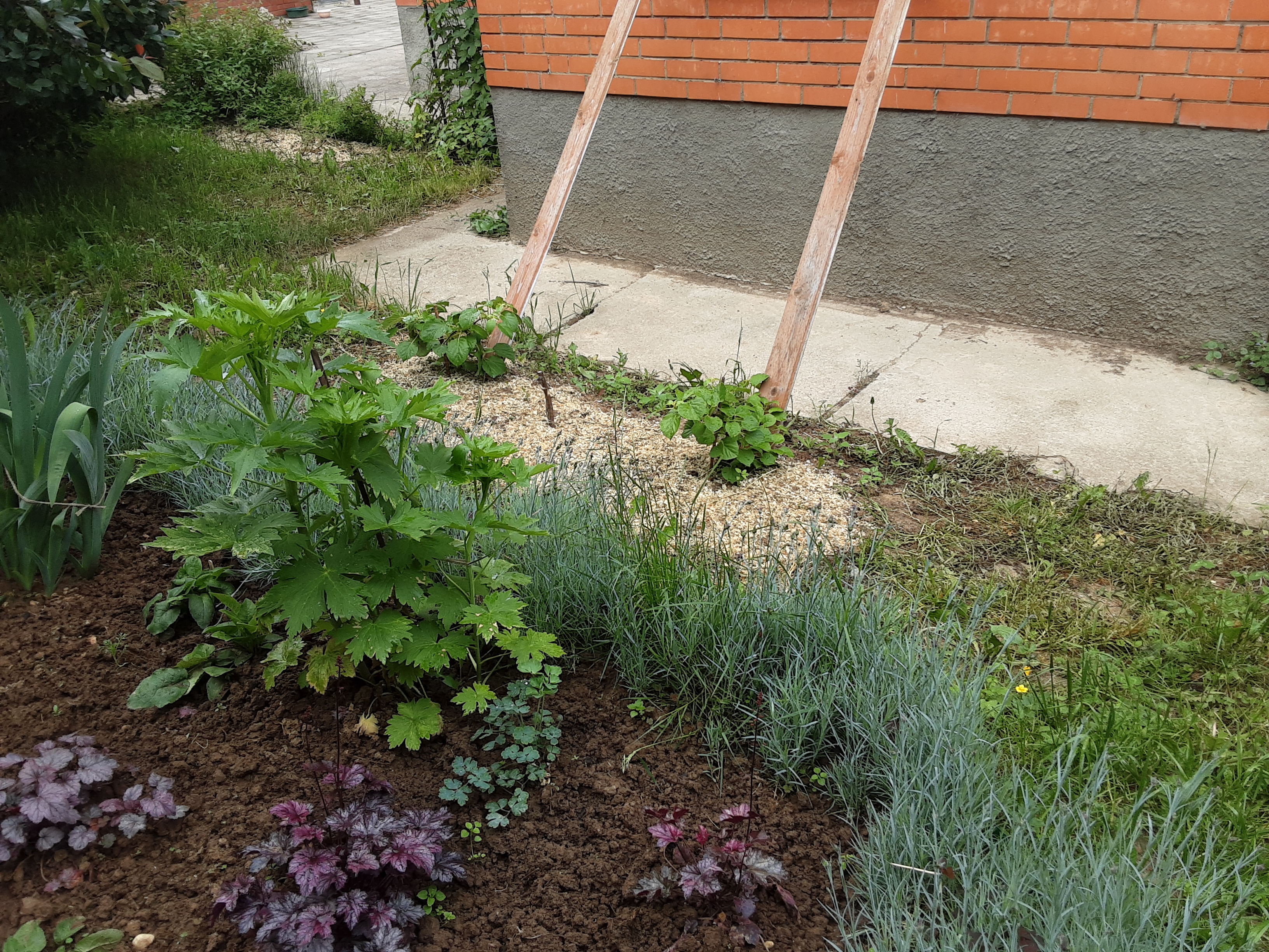 Тоже подумала про то,чтобы добавить справа вертикаль. Лен,а как насчет вейника Карл Форстер? Добавить в гейхерам ближе к краю или между ними.Он растет не очень быстро. Декоративен все время,не расползается.