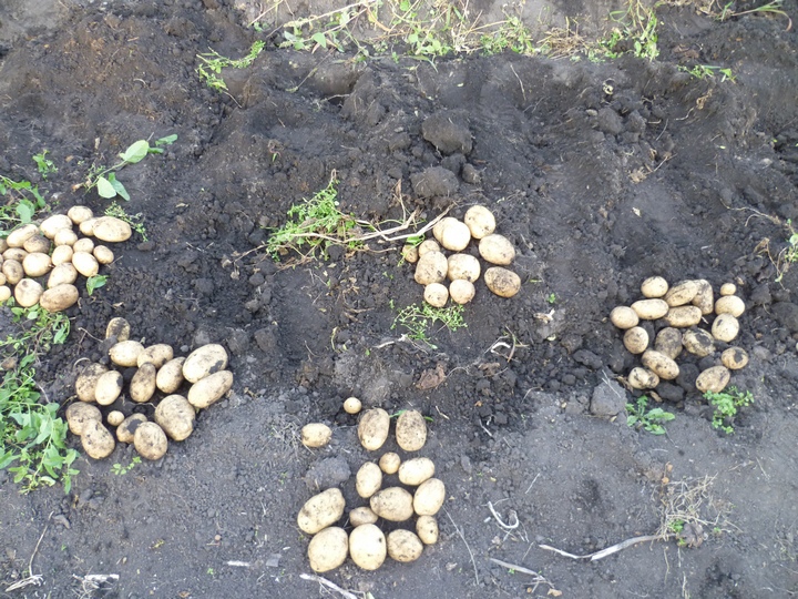 Целыми клубнями сажался Алый парус, Майский цветок и Великан. Размер клубней у первых двух меньше раза в два чем у Либеллы и Кюэке голд. Великан будем копать через неделю наверное, уже перед самым отъездом домой.