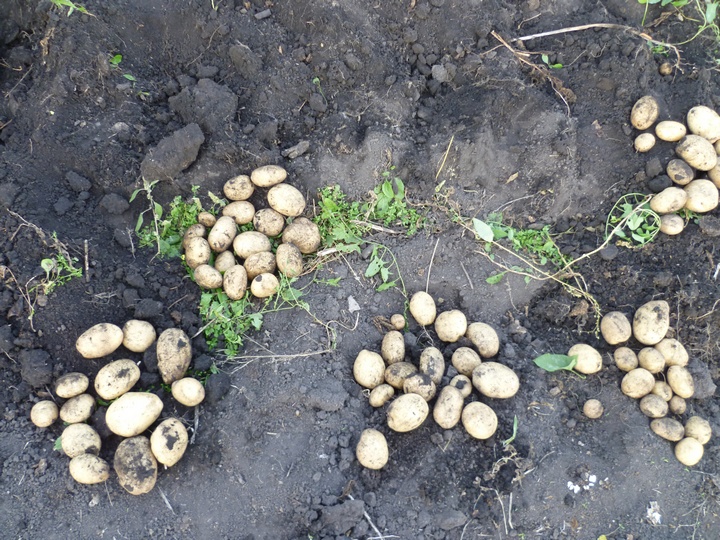 Мелочи практически нет. С 39 кустов собрал 55 кг. крупных клубней (отобрал для хранения) и 10 кг. семенной. Еще 3 кг. резаной забрал с собой на дегустацию. В среднем получается 1,74 кг с куста или при моей схеме посадки 750 кг/сотка.