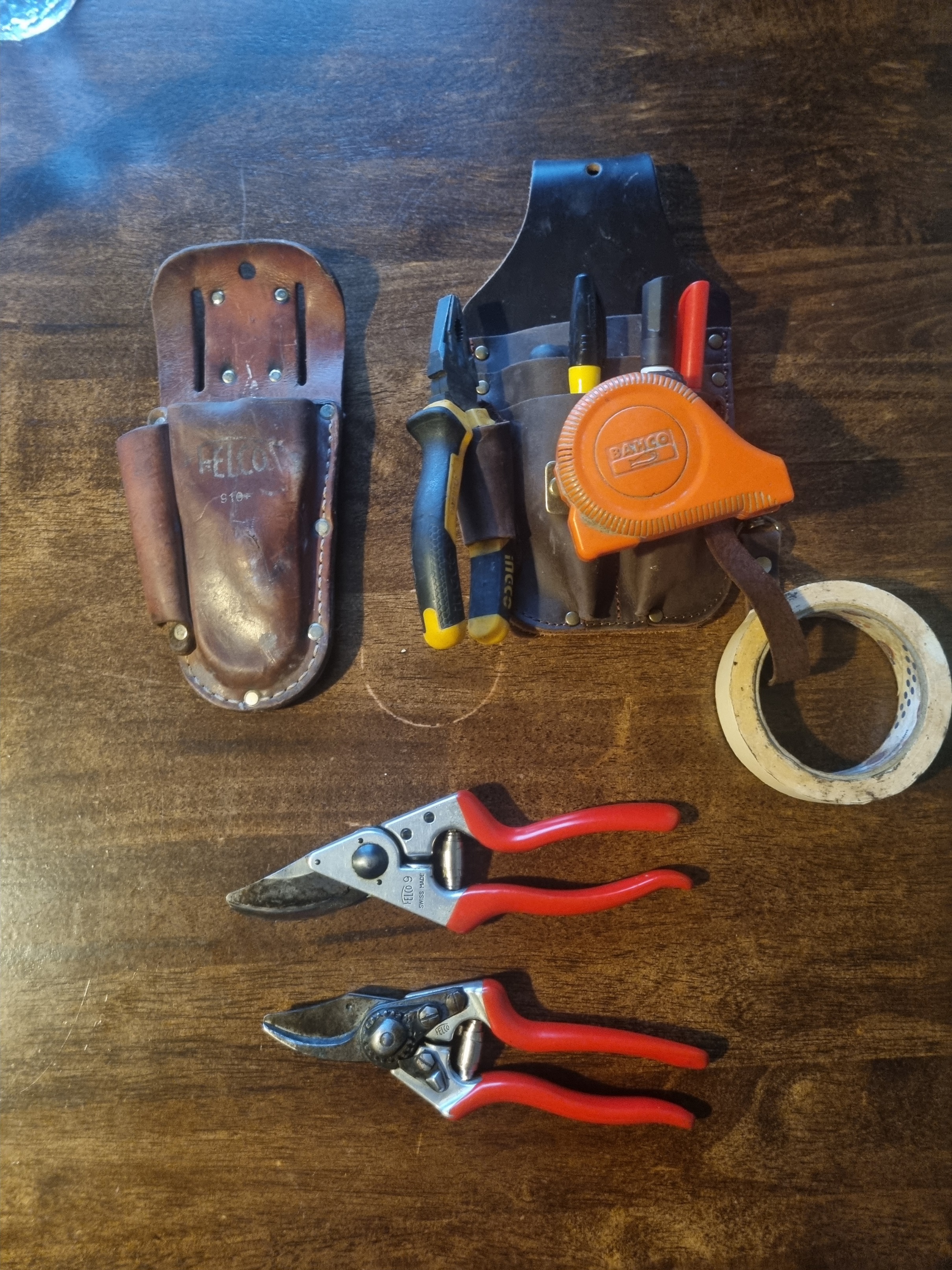 Изготовил для себя ремень с кобурой под секатор, ножнами, сумкой и еще всяким обвесом для свободных рук. Пока все нравится.Сам ремень из ремня безопасности ( вместе с защелками, вместо пряжки). получилось вполне удобно и практично.