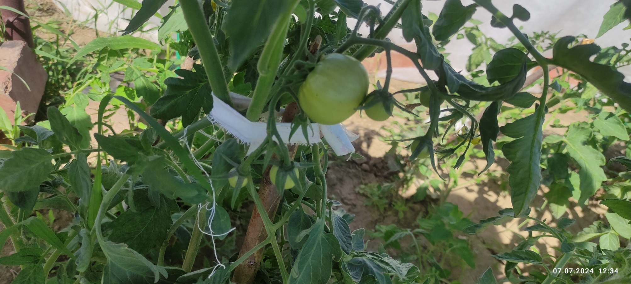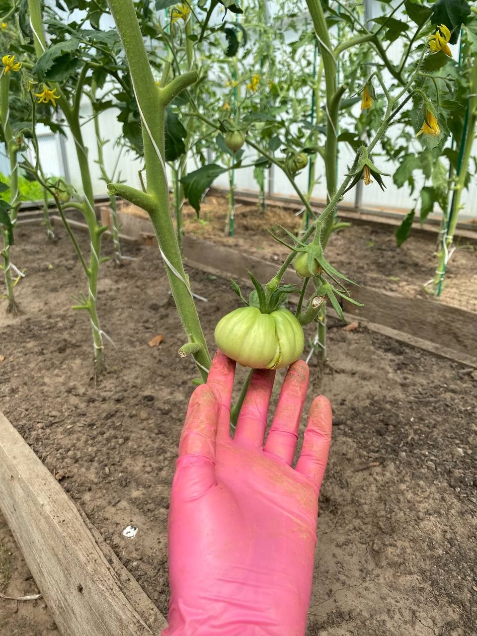 Что-то сажал по типу Бычьего сердца, но так не помню, надо искать. Сарра у меня первый сезон, зреет первый плод. С местом ей не очень повезло, тоже в конце ряда, возле винограда. Гибрид явно сильнорослый, а там больше двух стеблей никак не разместить, виноград разросся, давит. Увешался красивыми, крупными плодами, урожайность явно хорошая.