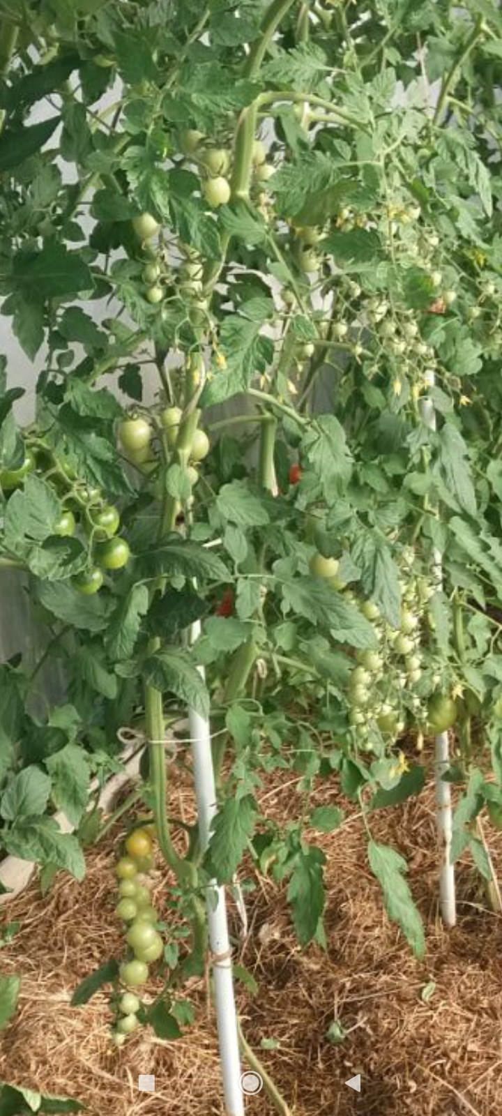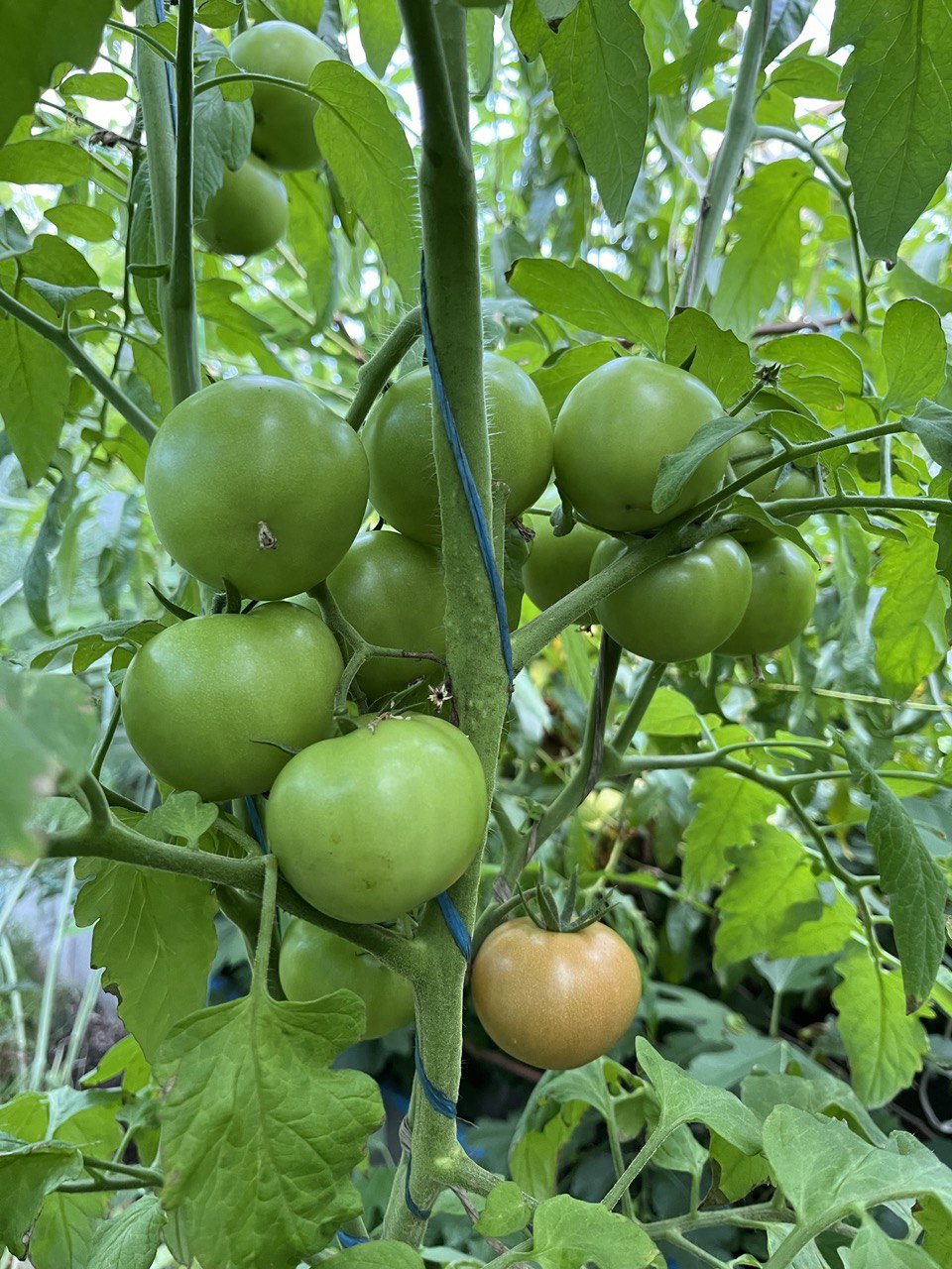Доросли до верха колышков, такое у меня было только в конце июля, на этом уровне у индетов обычно 3-4 кисти на чем я и вершковал. Теперь же не понятно что делать, вершковать рано, подвязывать некуда, шпалеру с верёвками городить точно не буду.