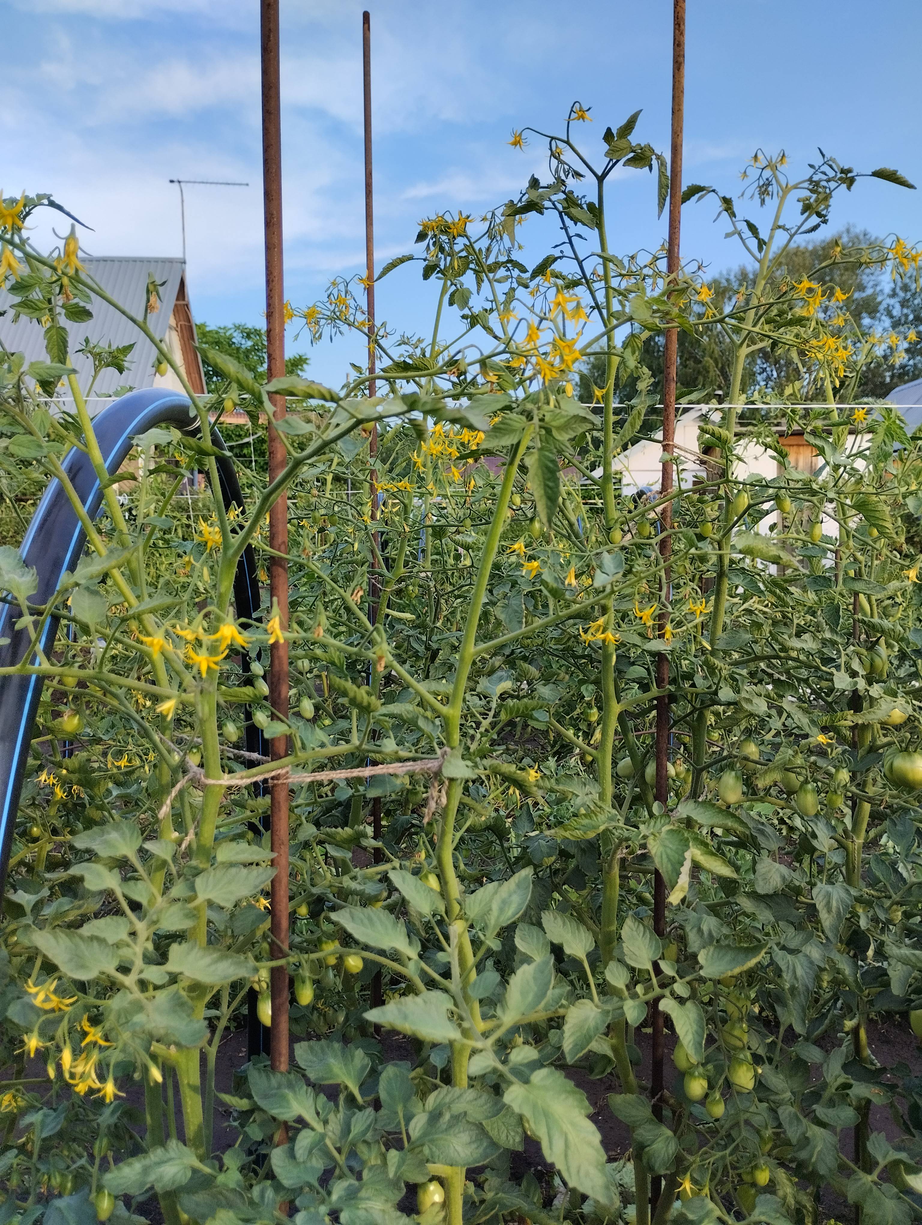 Алексей! Так два кола уже стоят и вверху веревка. Подвязывай к ней стебли. Еще пару кистей надо завязать. У меня примерно так же в ОГ. Но среднерослые-высокорослые веду только в два стебля в общей сумме до 6-7 кистей. После 25 июля все цветы прищипываю.a-i-barnaul писал(а): ↑04.07.2024, 21:03 вершковать рано, подвязывать некуда, шпалеру с верёвками городить точно не буду.