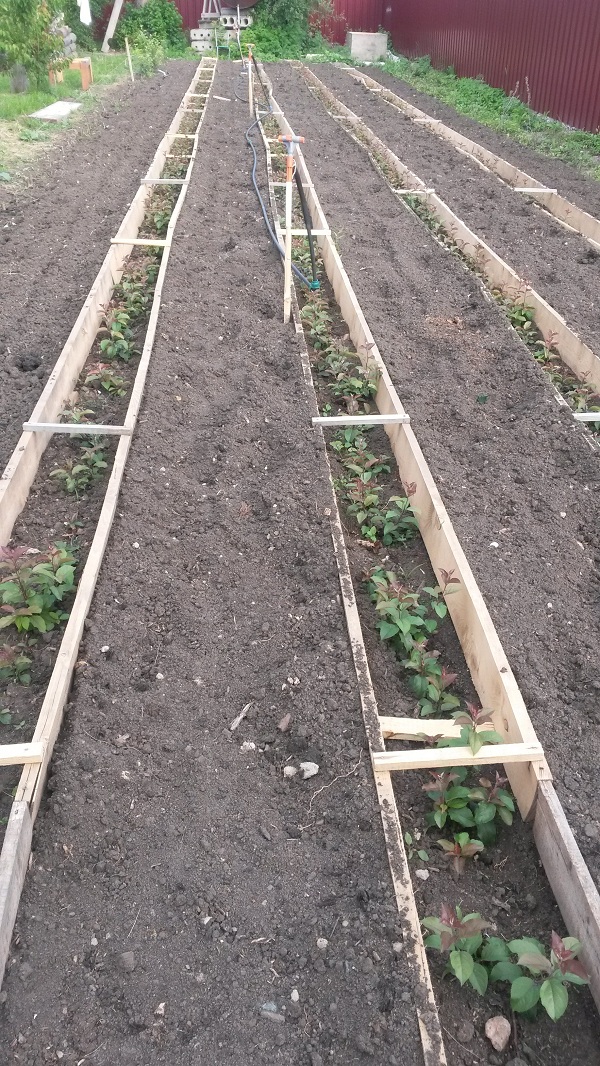 Соорудил борта из досок т. к. в целях экономии земли, ряды были посажены через метр.