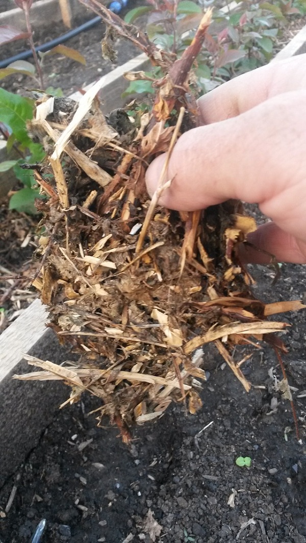 Смешать почву с щепой не получилось. Щепа залежалась, с низу заросла грибницей и превратилась в войлок.