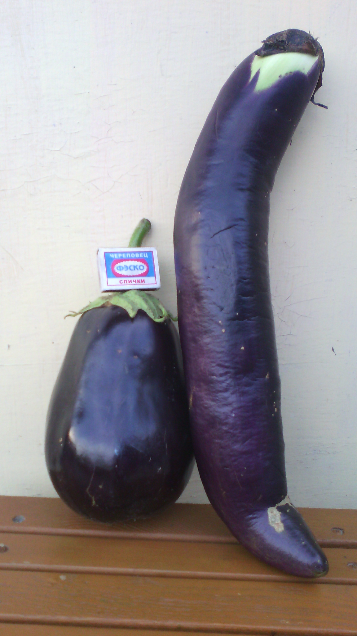 Баклажан для меня всегда был "пунктом Б", каждый год покупаю кучу цветных пачечек, сею в одну кучу, а потом ем то, что выросло. Поэтому никогда не знаю, как "зовут" то или иное чудо. В этом году выросло 3 куста с белыми плодами, хотя таких отродясь не покупала. Зато выскочило несколько кустов с настоящими богатырями. Хотелось бы повторить успех, но не знаю, что за сорта. Опытные форумчане-баклажанники, помогите в опознании длинненького. С круглого семена собрала, а про длинный замоталась и забыла. Теперь с радостью купила бы, но не знаю его названия.