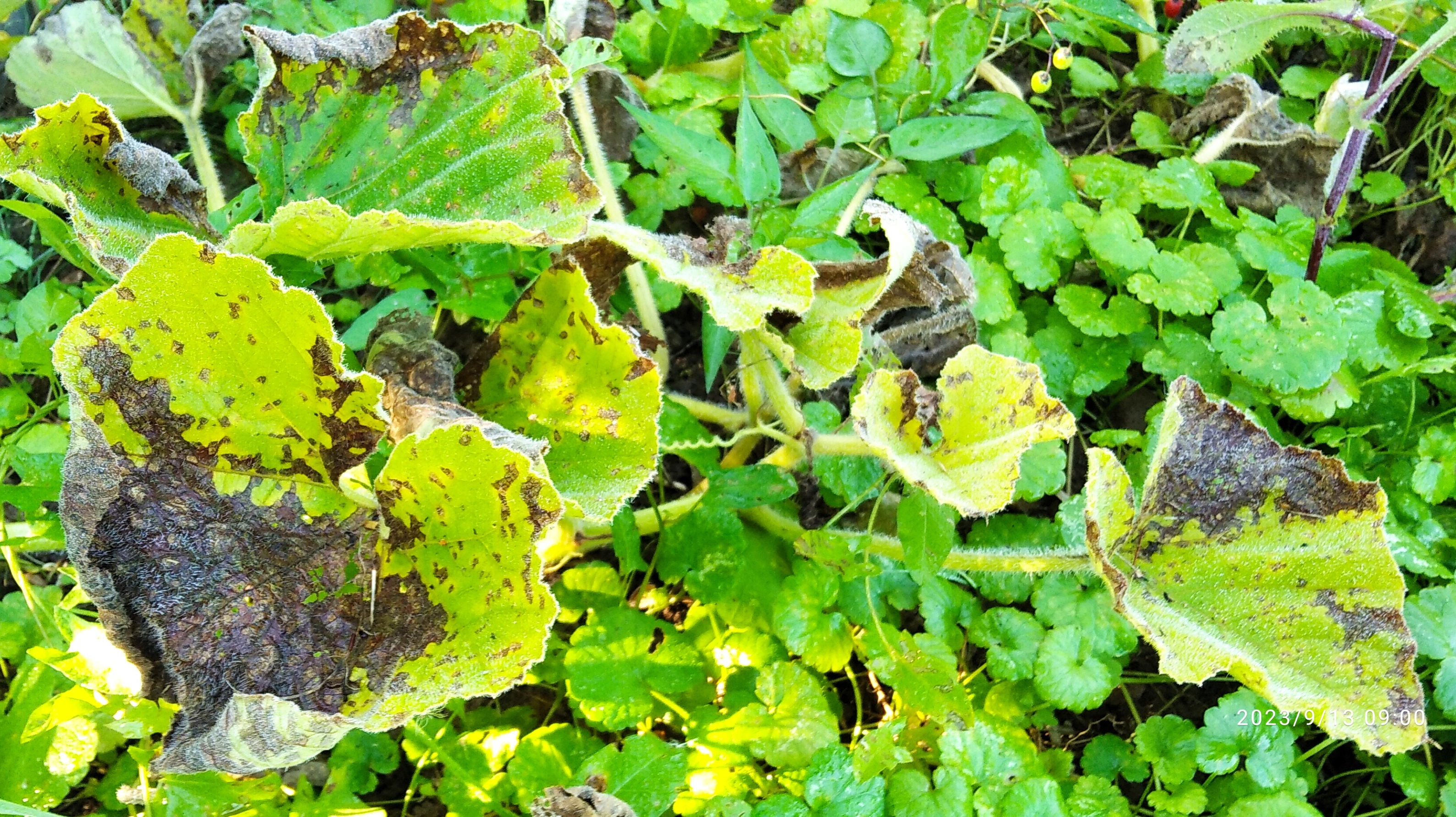 А прошлый сентябрь и у нас был тёплый. Только уже 9 числа ночью был слабый заморозок, листья тыкв подмёрзли (фото через три дня), как и сами тыквины, которые я до того не убрал