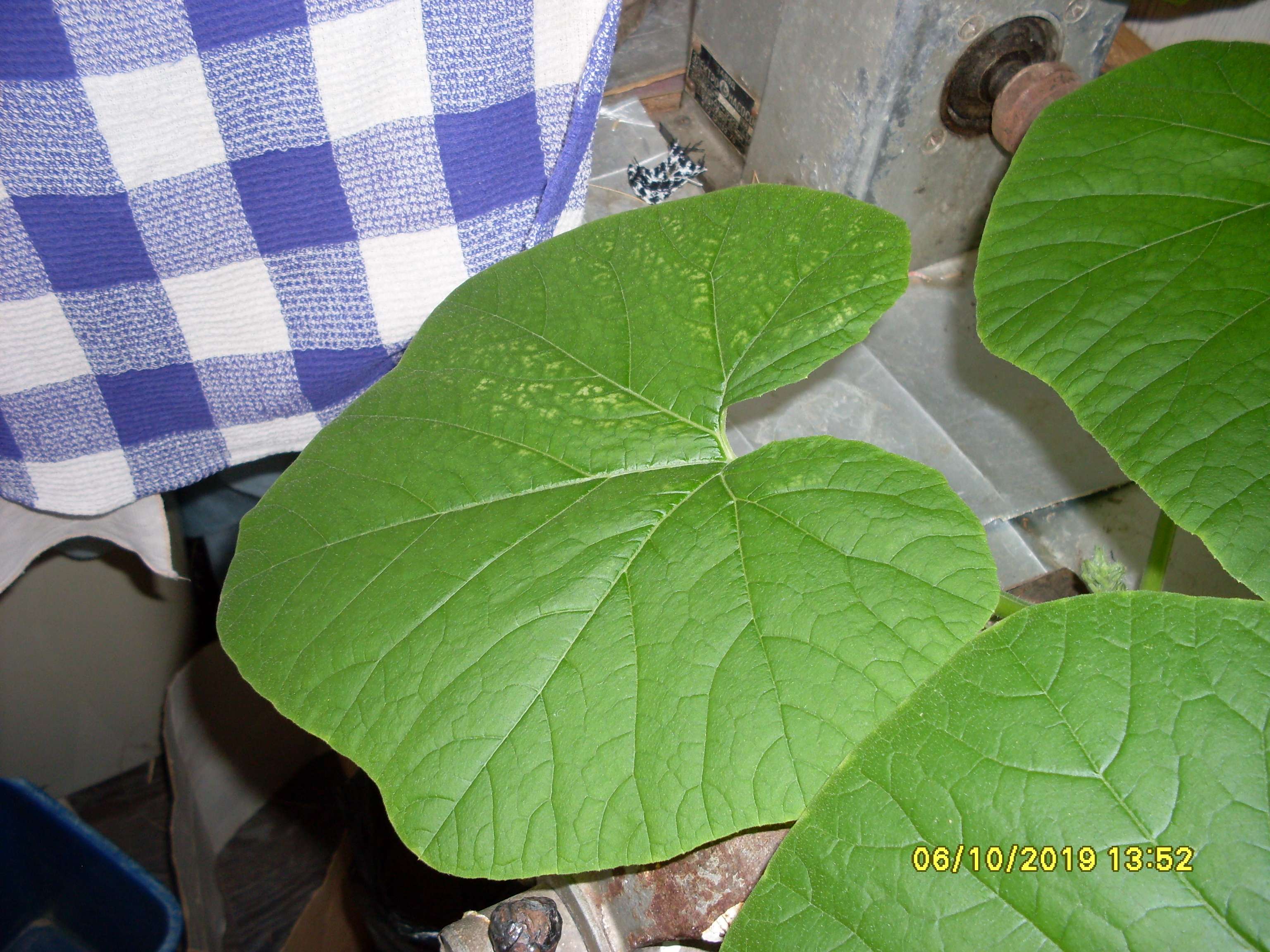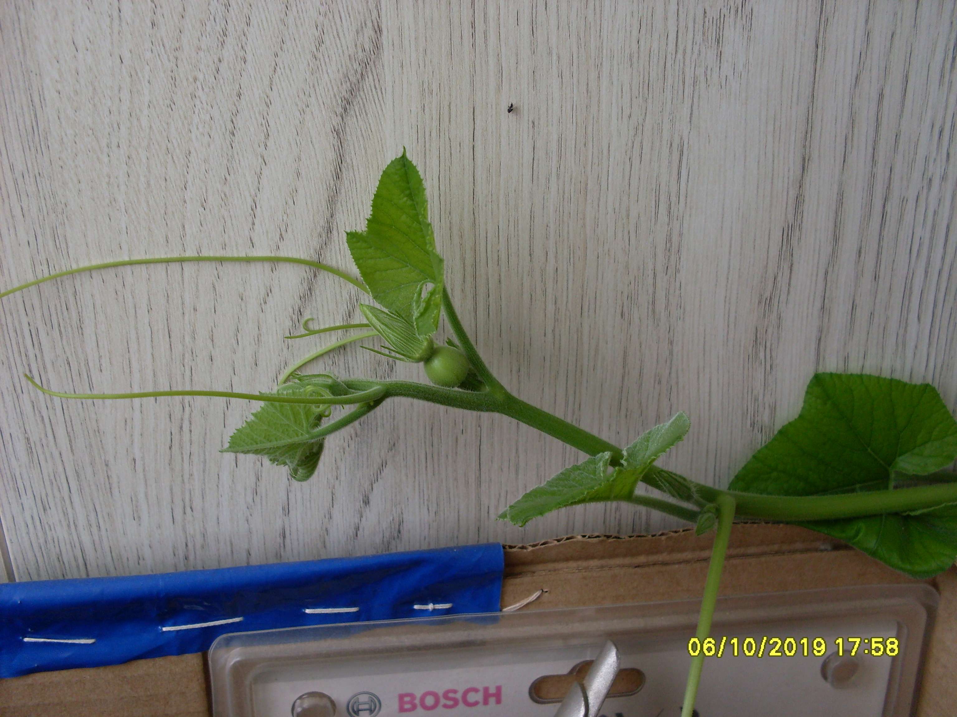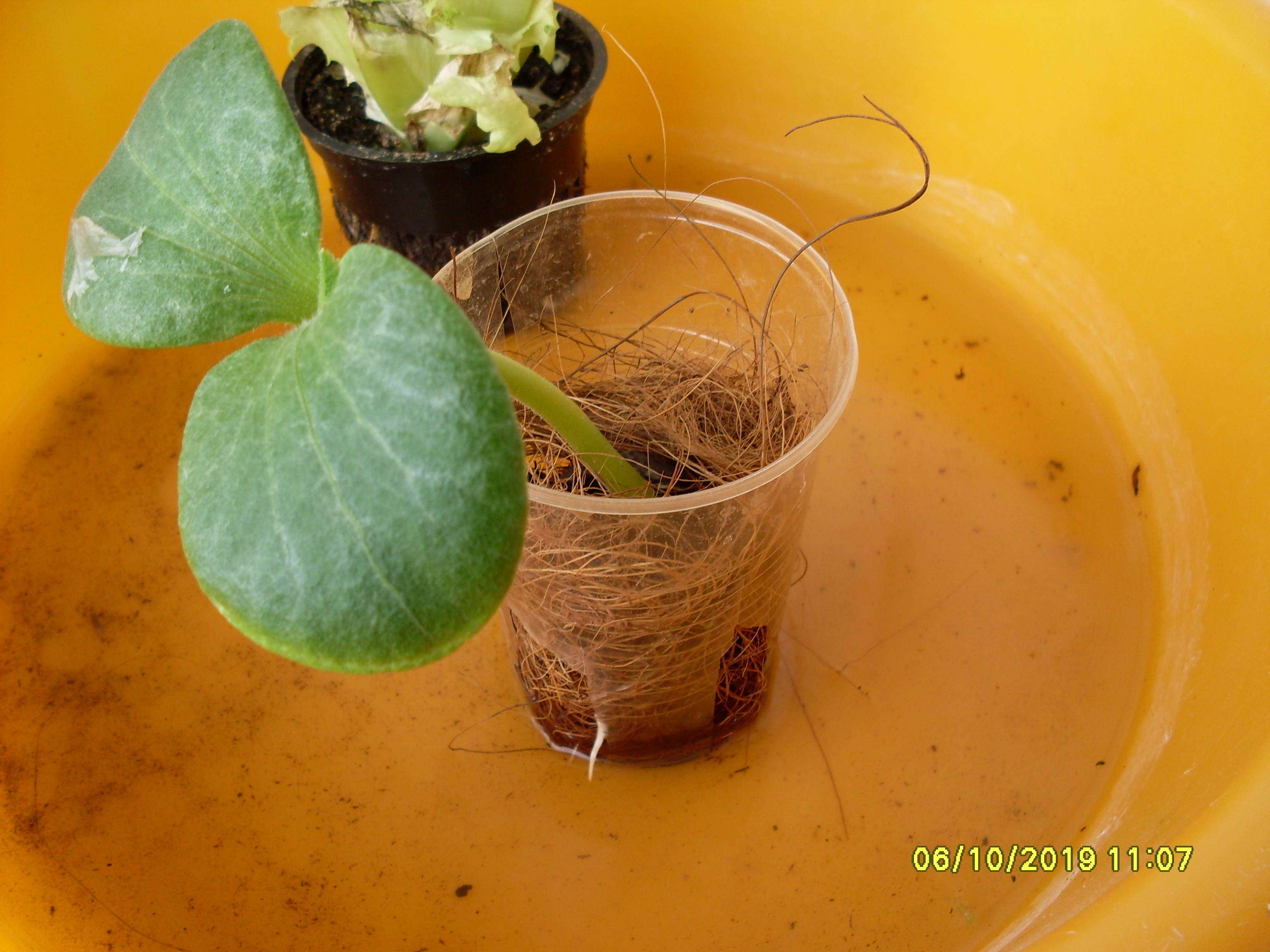 Новый посев. Тыква обыкновенная. Выросла из косточки, из тыквы купленной на базаре. Вытащил косточку из тыквы, тыкву съел. Засунул косточку в торфяную таблетку и она проросла. Затем засунул торфяную таблетку в стакан с кокосом волокно и поставил в тазик с раствором. Раствор 2:1:3, месил по калькулятору, по профилю GHE.