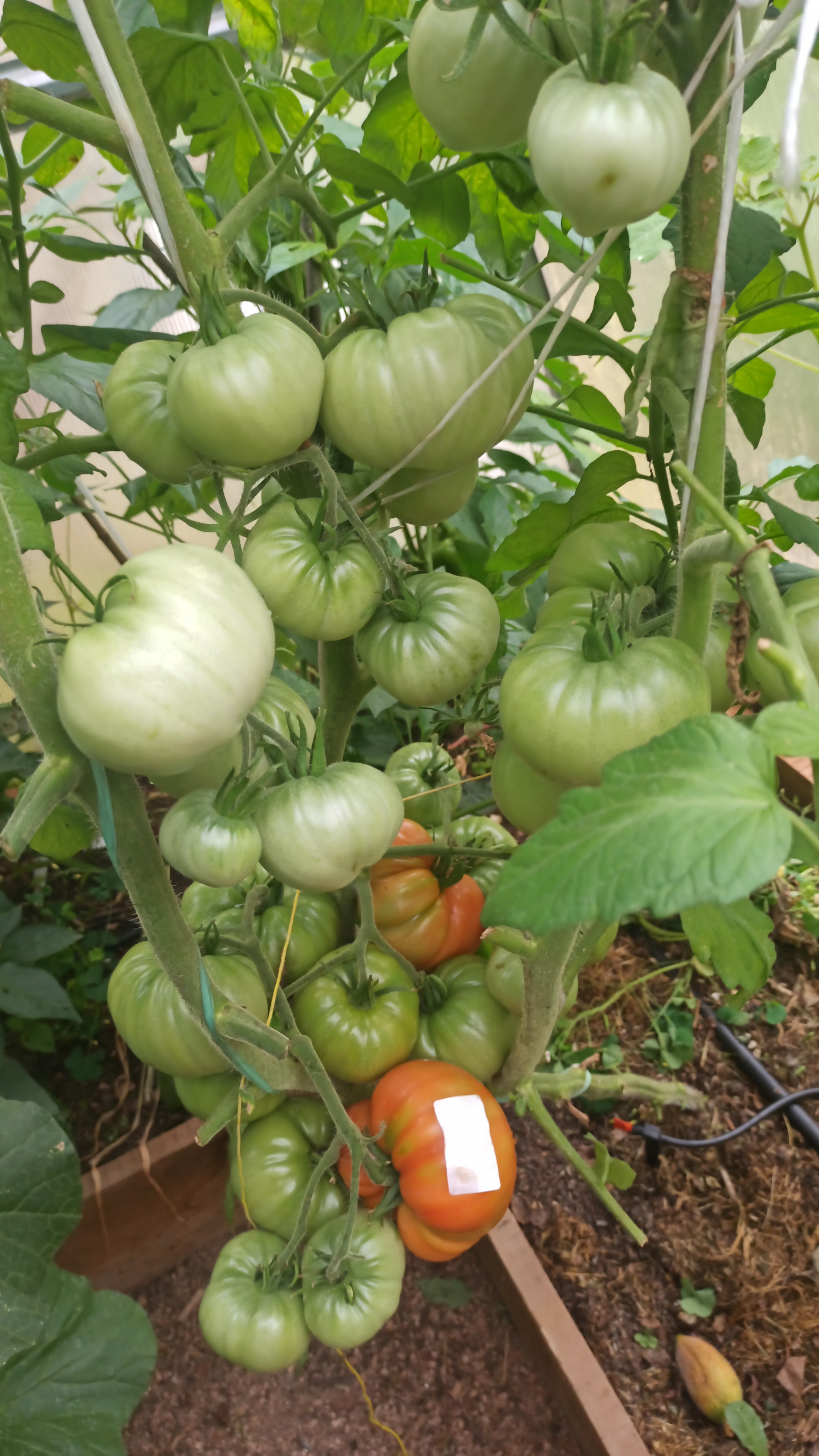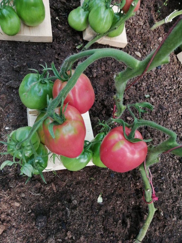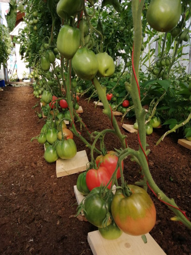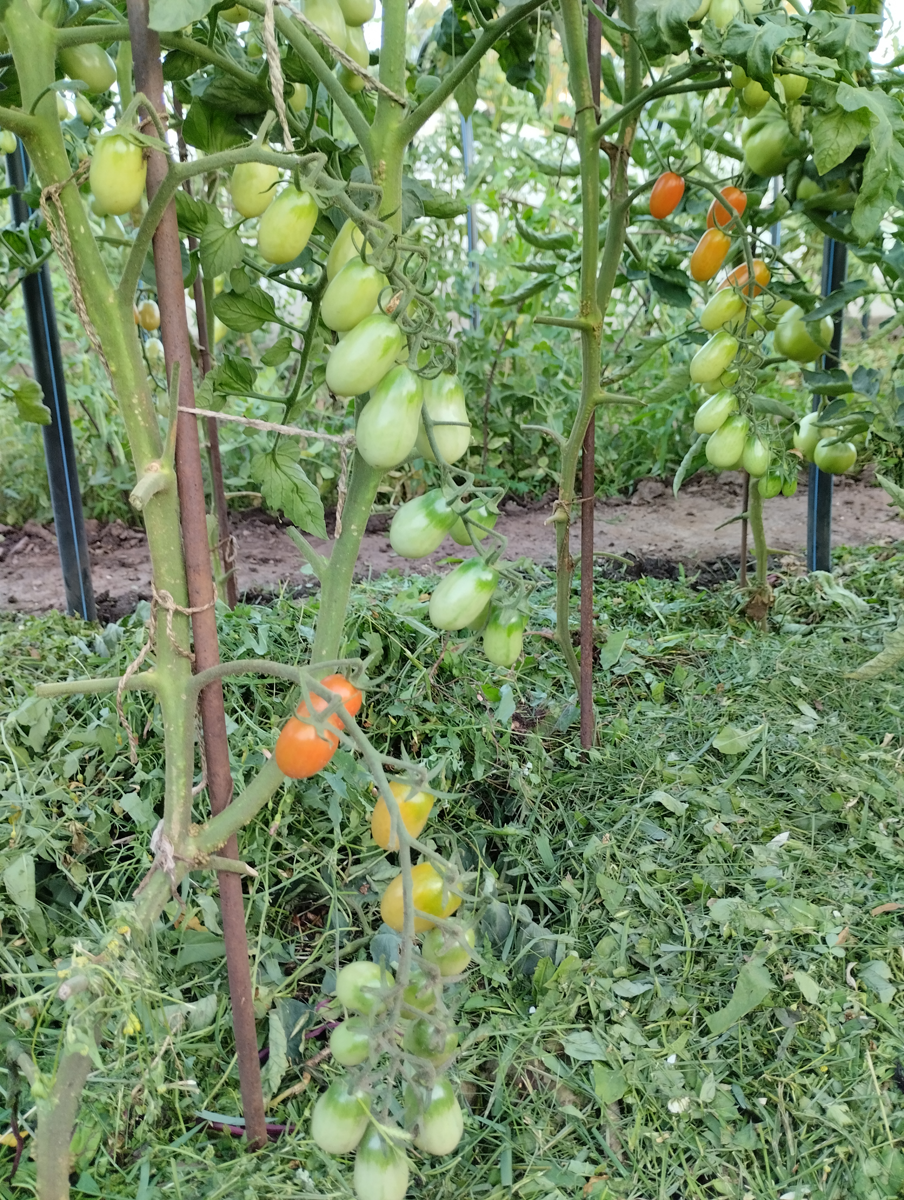 У меня в этом году томаты радуют. Плотная посадка пока сыграла в плюс, мало сброшенных кистей, притенили друг друга что ли...