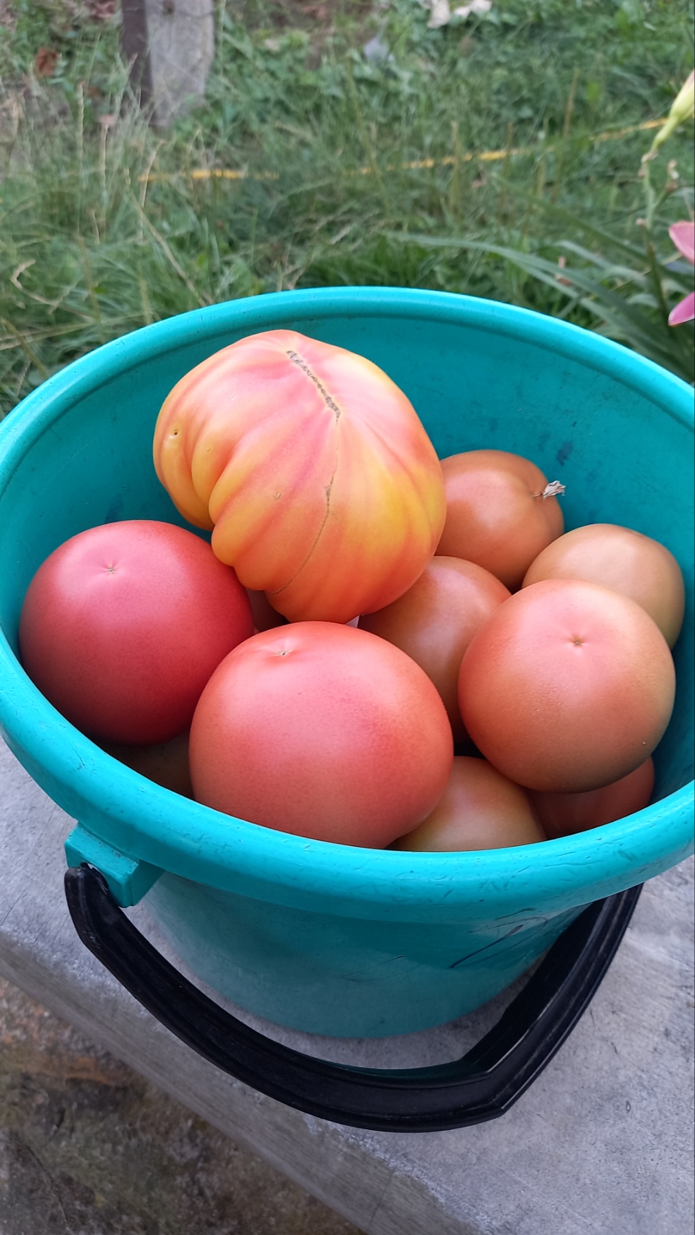 Вкусом на данный момент (ещё не всё пробовала) выделились: Немецкий розовый Йодера, очень вкусное розовое сердце, прелесть. Помидора ранняя от Гусева вкусная (первая кисть самая красивая в теплице, любовалочка). Белоплодный томат Бело-розовые полосы (жёлтые у меня обычно безвкусные, а тут и сладинка и кислинка и аромат, всё как надо, не обманули). Потом порадовали сладостью все сосульки от Гавшиш, на уровне Саммер сан, достойные по этому признаку, кусты слабоваты. Атомный виноград обещает быть сладким, по попробованному недозрелому помидору, но ещё спеет. Ну и Краски- Саммер сан каждый год, без него теплица- не теплица.