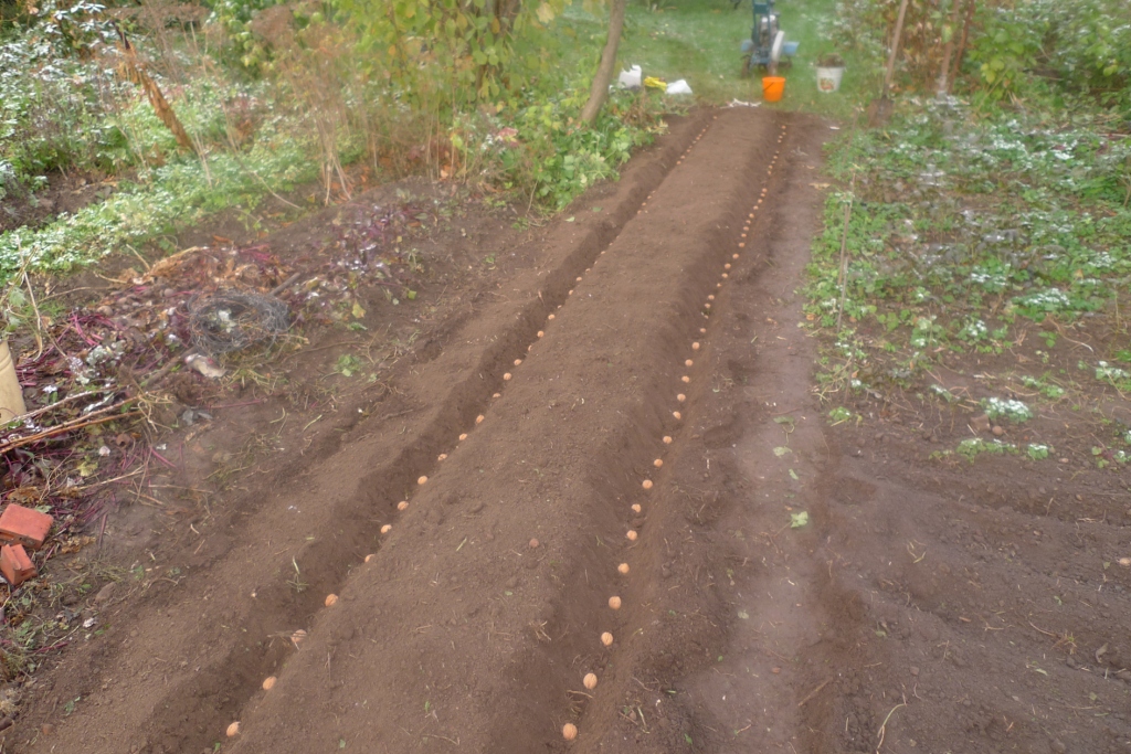 Сегодня высаживали орехи, все не успели, завтра продолжим. На грядке четыре рядка, два из которых закопаны.