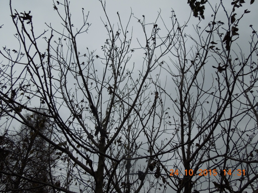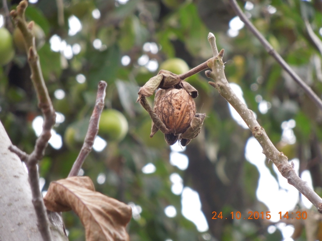 Лист с ореха облетел, был мороз -8. Околоплодники еще на дереве, часть их облетела, но и по этим видно, что орех плодоносил везде: по окружности кроны, на макушке и внутри. Кое-где висят еще орехи.