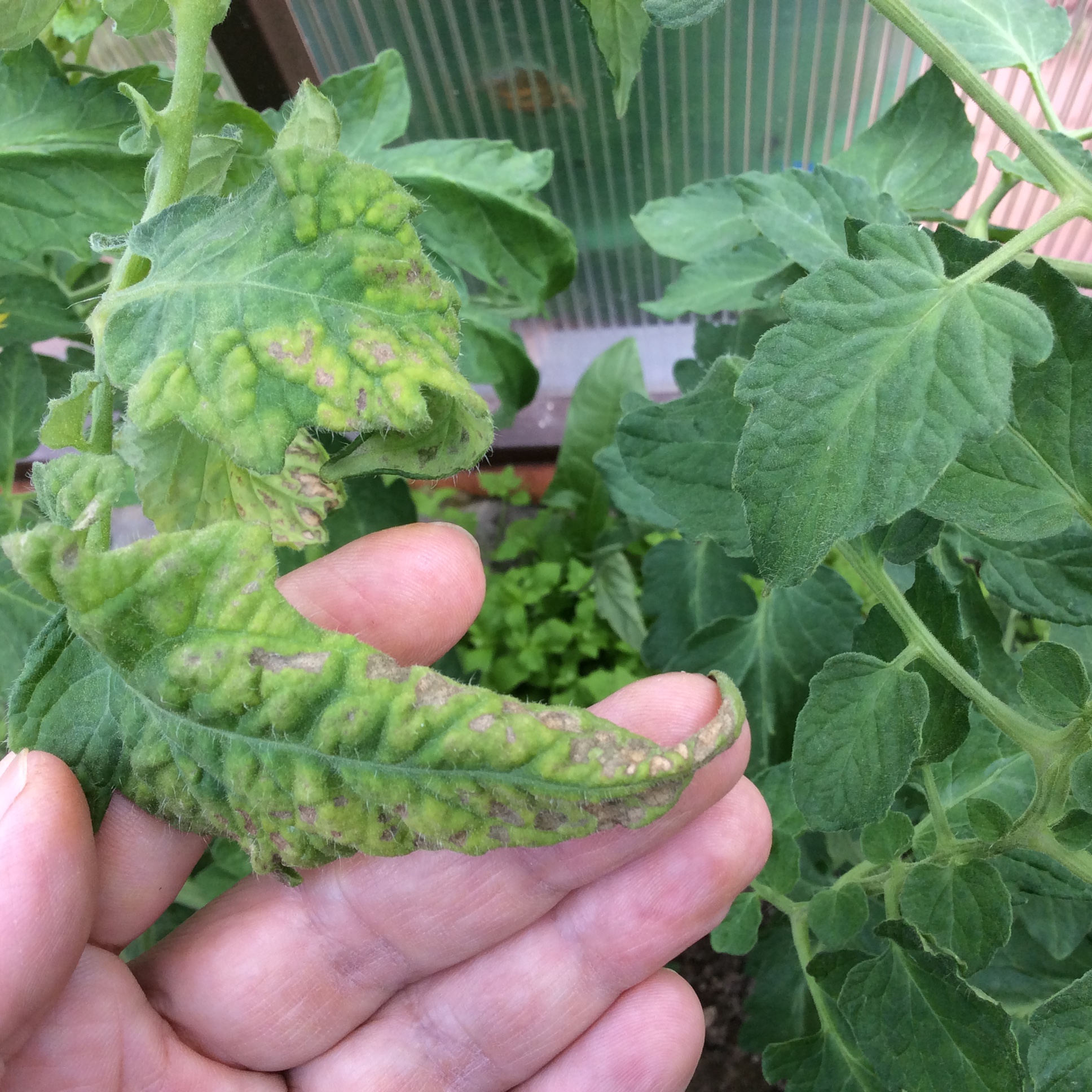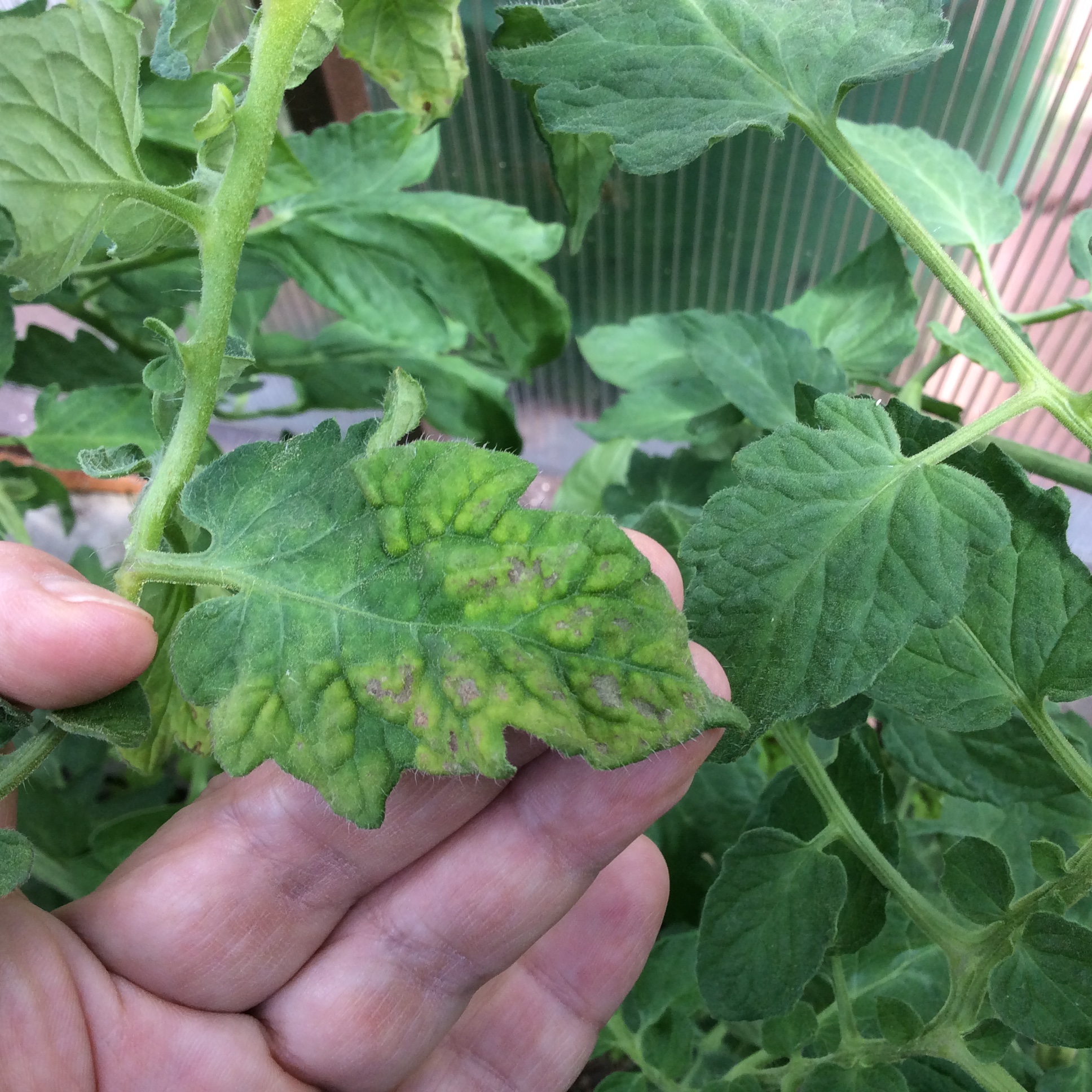 Недостаток калия, магния и кальция на что подозрение из-за формы о окраски листа. Подозрение на вирусы так же остаётся.