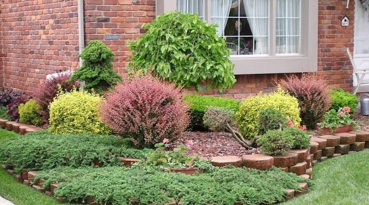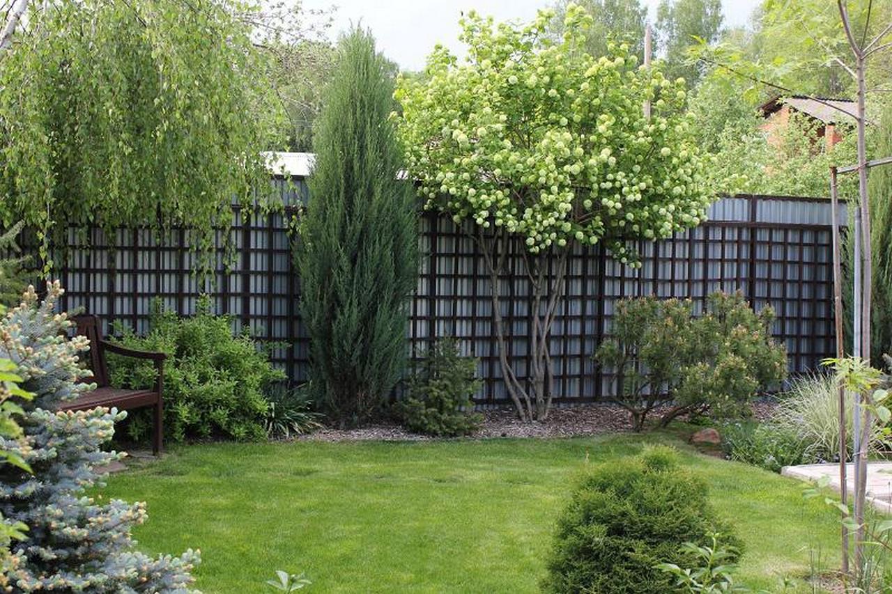 Если соседке не обязательно хвойные, то вот вариант с кустиками. Представьте, что это не дом, а забор, а по нему ещё клемики запущены по опорам из ковки.
