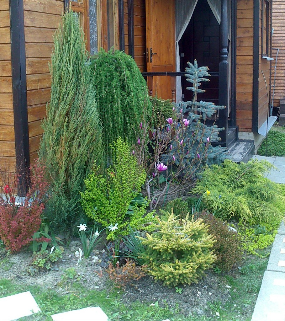 К стенке высаживаем высокое и узкое, а остальное рядом. Кстати, горные сосны отлично смотрятся.