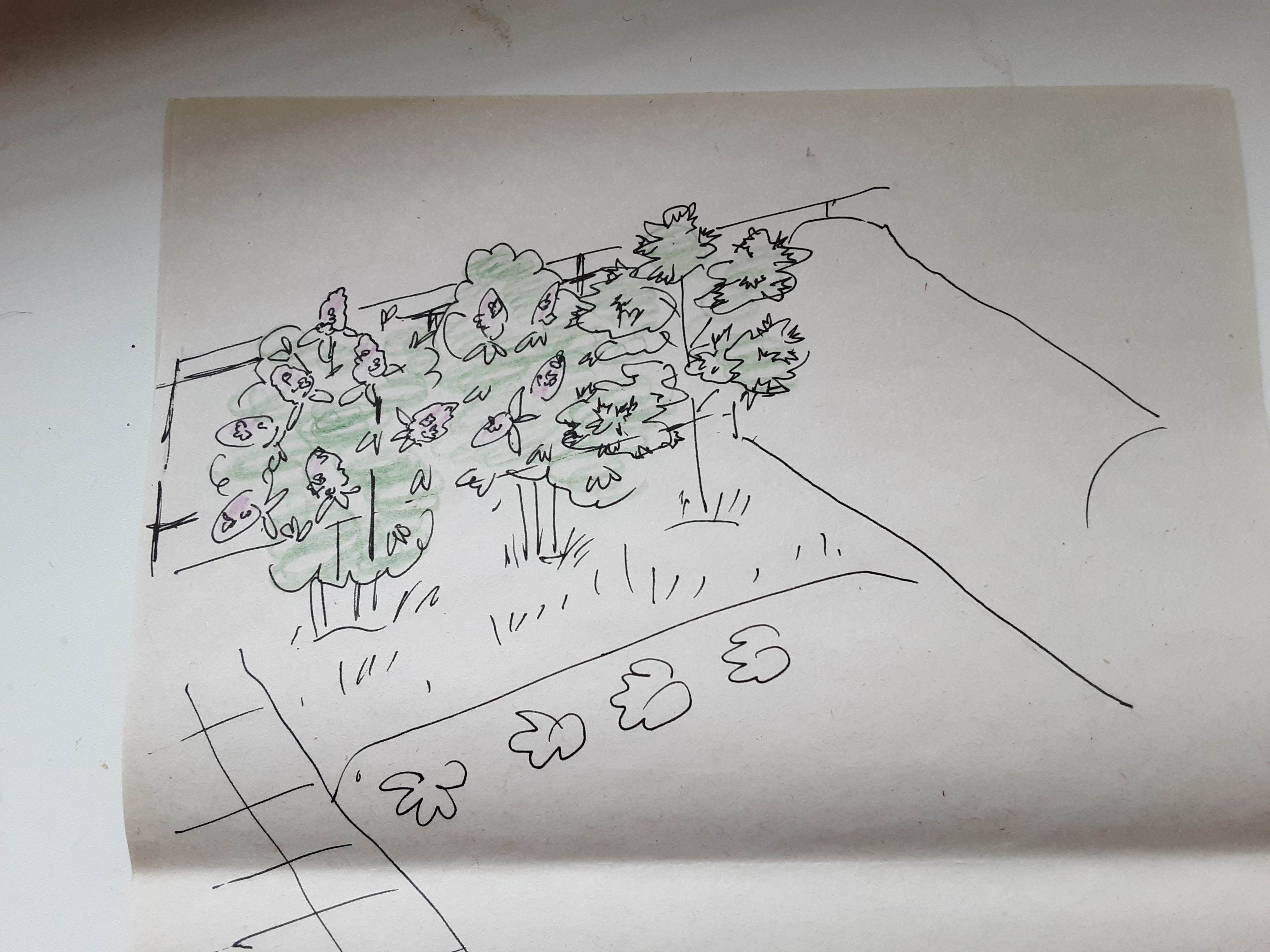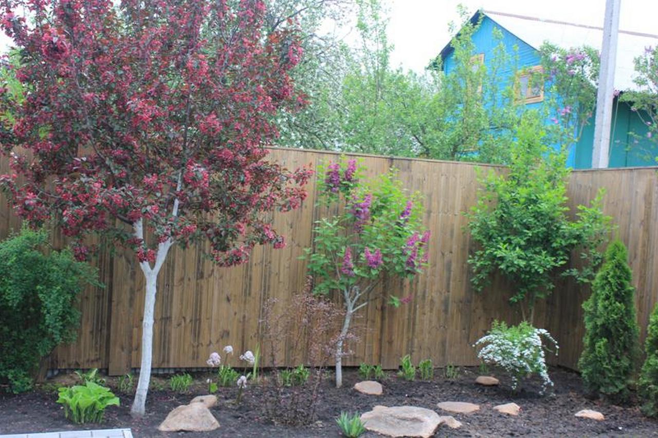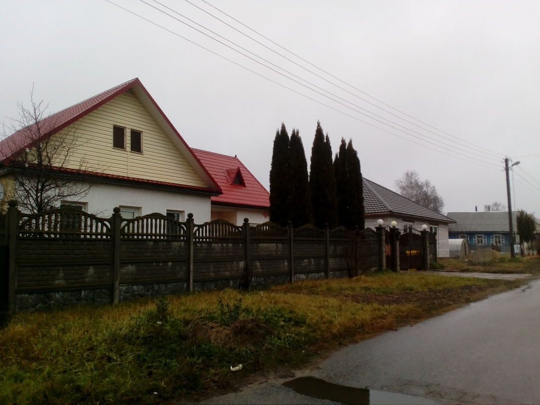 Вот еще одно фото того самого южного забора, перед домом лужайка с калиной и по периметру еще что-то, дальше большой яблоневый сад.
