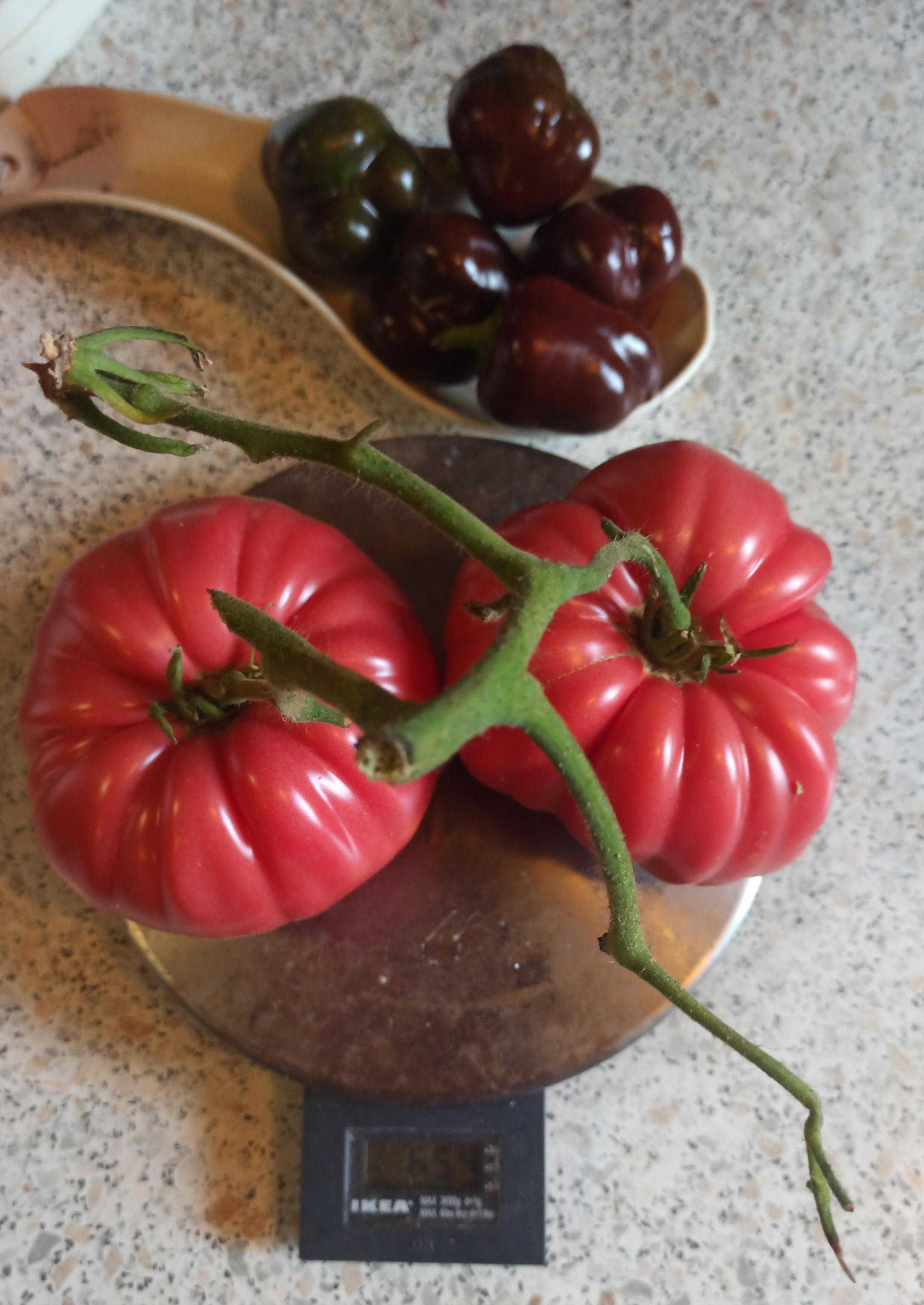 Могу сфоткать последние два томата от первой кисти гусевской ранней Помидоры. 654 гр. Они там были пять все абсолютно одинаковые, как калиброванные с картинки! Получается кисть больше полутора килограммов. Необыкновенной красоты!