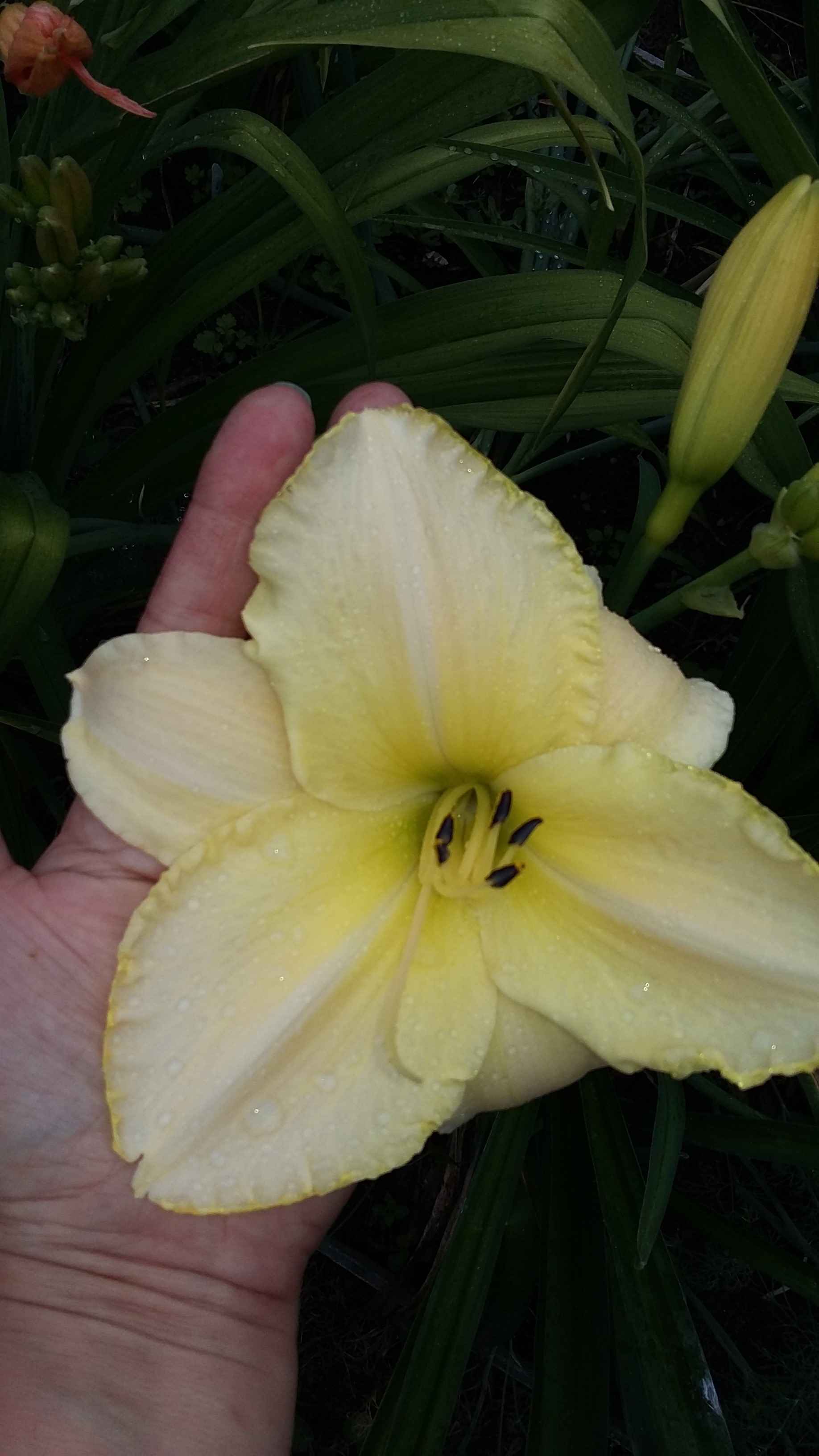 Ооочень крупный цветок, самый крупный из моих лилейников, цветонос высокий. Цвет даже не знаю, как точнее описать. Светло-светло-лимонный, очень яркий и одновременно нежный. На фото цвет передан точно.