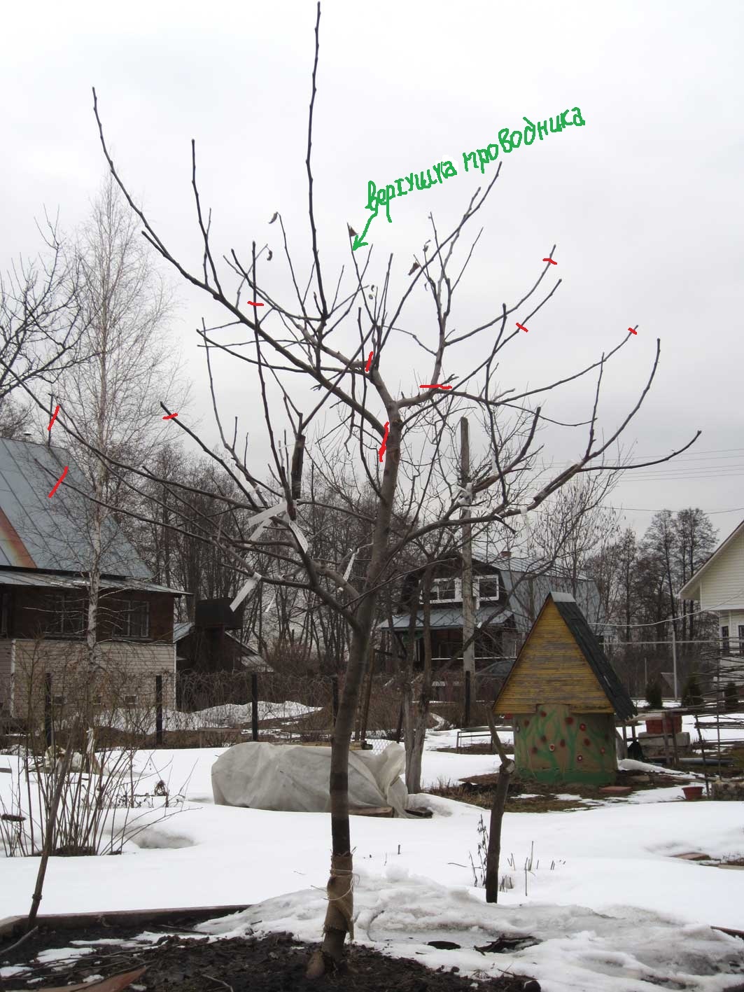 Уважаемый Вячеслав30, На фото четко просматриваются допущенные ошибки при формировании кроны.Первоначально заложен классический вариант разреженно-ярусной кроны, первый ярус ветвей заложен очень правильно по распределению в пространстве и имеет хорошие углы расхождения и отхождения от ствола, но в верхней части кроны очень рано был удален центральный проводник( это то что я заметил на снимке), возможно есть другая причина утери лидера и не успели заложить пару хороших полускелетных ветвей второго яруса. Кроме того, все ветви первого яруса Вами перепривиты, этим Вы ослабили ростовые процессы в первом ярусе. При перепрививке растения необходимо было обрезать и соподчинить верхние ветви с ниже лежащими. Этого не было сделано и в верхнем ярусе за счет перераспределения питательных веществ выросли мощные приросты. Чтобы придать лидирующее положение ветвям из прививок, необходимо резко ограничить в ростовых процессах ветви второго яруса и сформировать две или три полускелетные ветви основного сорта. Считаю первый вариант Зарянки очень подходящим для этого дерева. Единственно что бы сделал я, не удалял полностью верхнюю мощную ветку(на снимке уходящую влево), а двумя переводами на боковые ответвления сильно уменьшил ее размерВячеслав 30 писал(а):После бурной дискуссии отгибать/резать, прошу подсказать, как укоротить верхний ярус и надо ли?