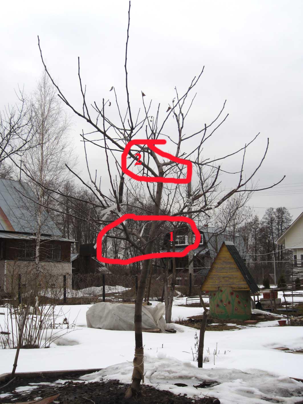 Надсечки прочности скелету не придадут, согнуть (как и "выпрямить") острый угол вряд ли получится, по этой причине наиболее разумны варианты или сразу вырезать "1 левая" и "1 правая" или оставить часть структуры от них временно не давая сильно увеличится приросту (пытем прищипок и пригибу побегов вниз на плодоношение) и толщине этих веток. Причем за год вырезать всего по 1 такой уже достаточно серьёзной по диаметру ветке, т.е. совсем не обязательно удалять эти две верхние ветки "1 правая" и "1 левая" одновременно или сначала не попытавшись их использовав на плодоношение (через радикальное отгибание которое не приведёт со временем к сильному увеличению диаметра тем более по сравнению с утолшающимся проводником).Zaryanka писал(а):Где стоит цифра "1", там - надсечки.