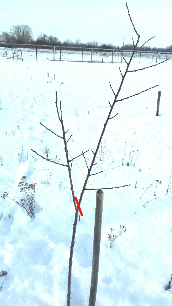 Андрей,обычно ниже среза на 6-8 почек закладывается очередной ярус.Это к вопросу где резать проводник.Либо не резать,а загнуть на 90 гр в свободном секторе,получится первый кандидат на скелетную ветвь второго яруса,а ЦП сформируется из самого верхнего пробудившегося побега,нижележащие также пойдут для формирования второго яруса,а лишние выламываются.Бельевыми прищепками можно изменять угол отхождения побегов от стволика,вплоть до 90 гр.Между верхней веткой первого яруса и пердпологаемой нижней веткой второго яруса не менее 50-60 см.