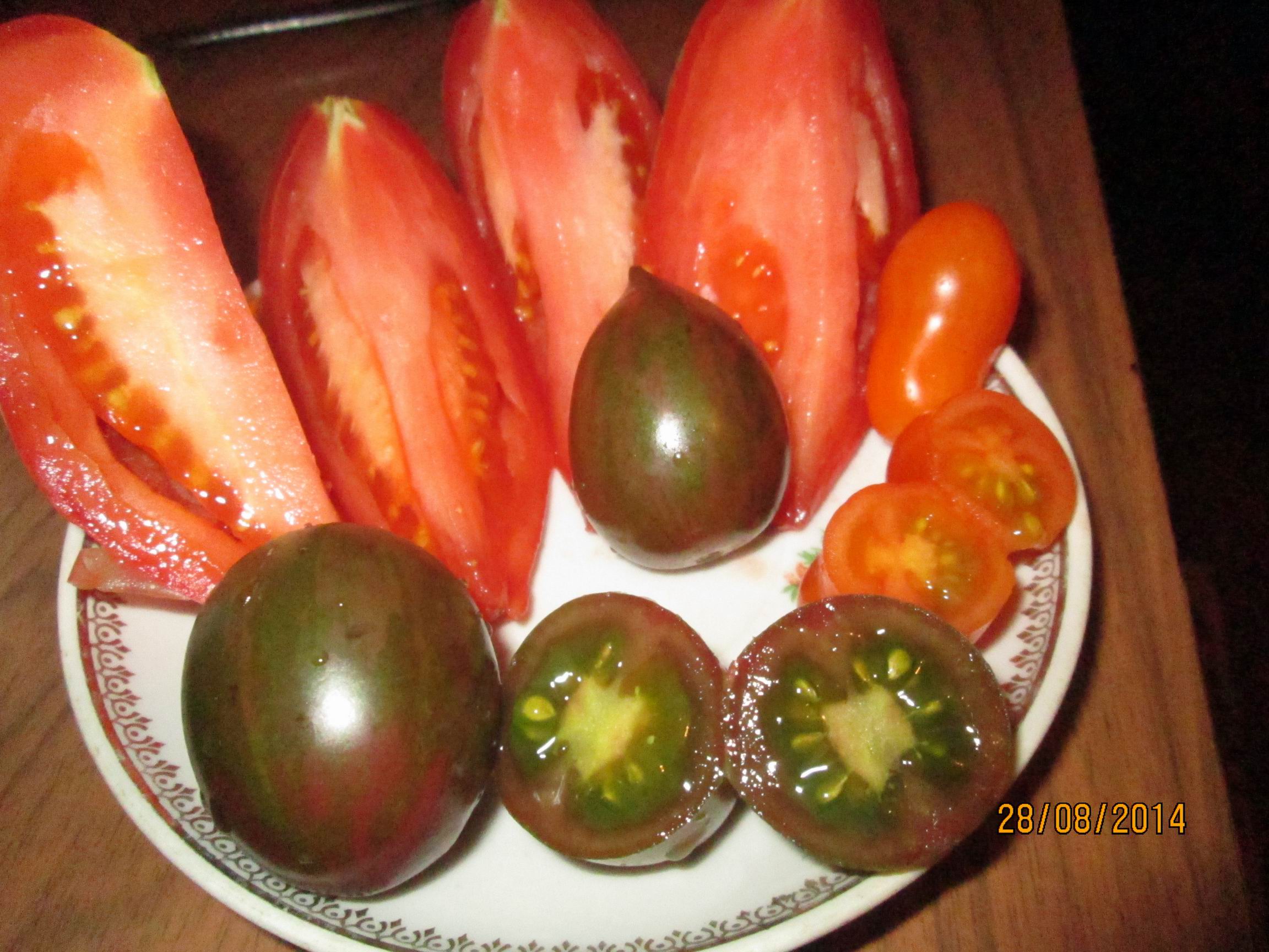 Выращивала Русский Фиолетовый, цвет, конечно же, условно фиолетовый, сорт относится к черноплодным томатам. Мне очень нравится, рос в теплице, фото нашла, от центра тарелки чуть левее - малинового цвета - Русский фиолетовый, уже хорошо вызревший.Посадила в этом году, уже 4-й раз.