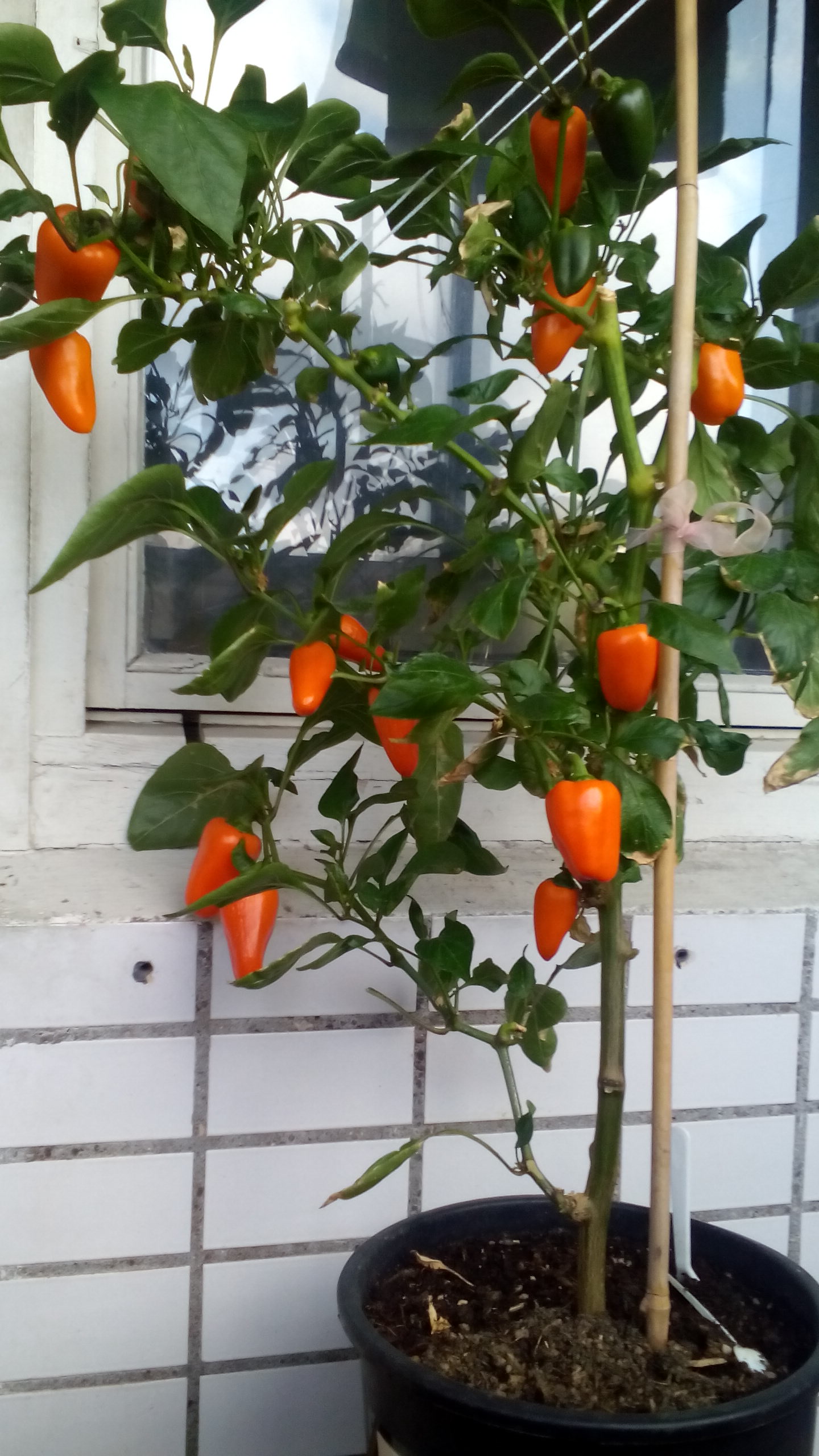 Показываю,да сниму с него перчины спелые.Всего 17 штук сейчас.Но мелкие. Баловство кончается,много перцев с грядки ,буду его ликвидировать,а на его место поставлю другой. Выкопаю с грядки горький букетный и в горшок. Там завязей очень много,шт до 50 будет,а то и больше. Пусть живет на балконе и в кухне зимой. Перчики в борщ прямо с куста брать буду.
