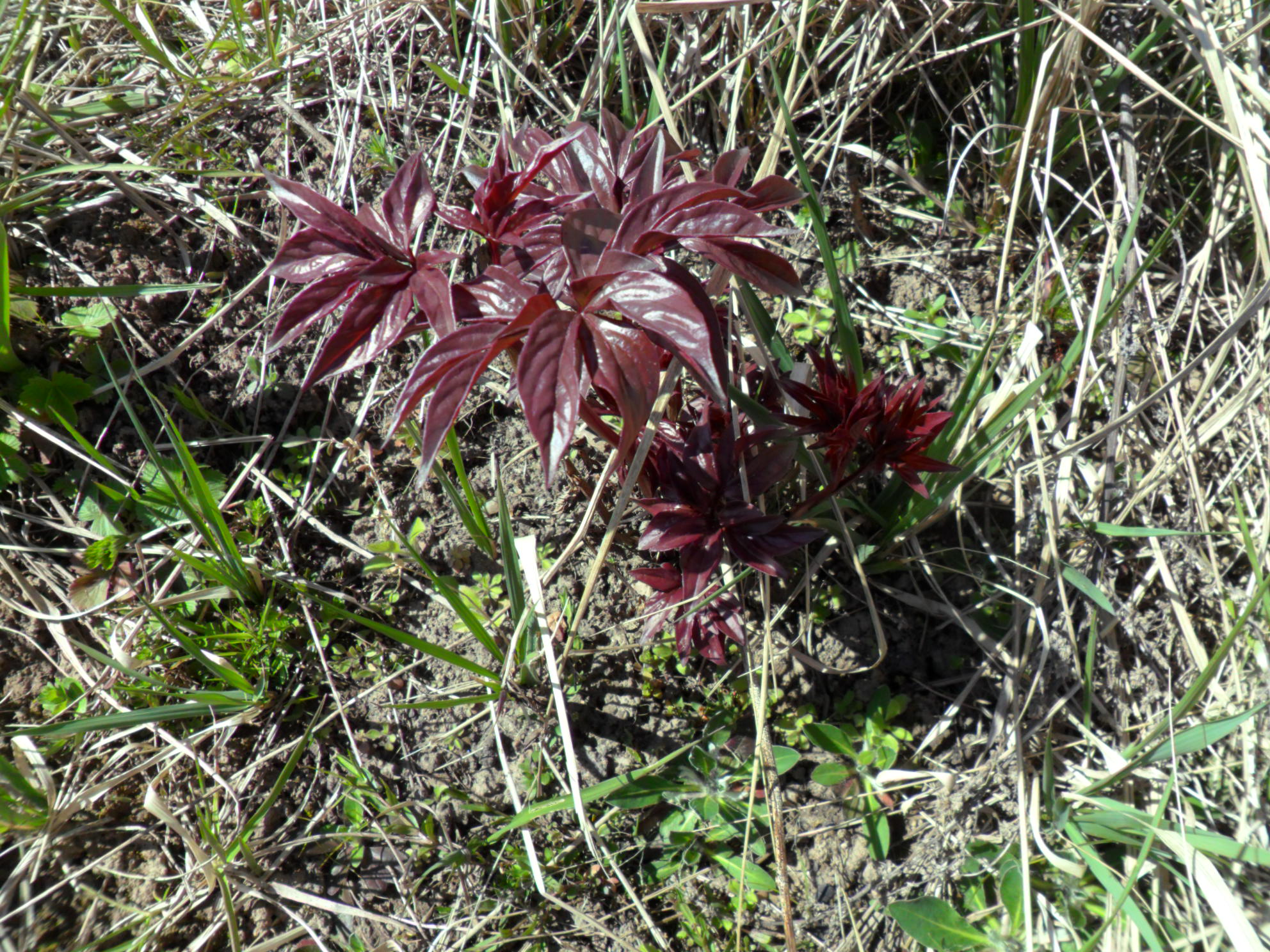 Большое количество антоцианов, придающих такую темную окраску, вырабатывается в клетках под действием низких темпертур весной и осенью. Ночи были холодные - и вуаля! - мы любуемся пурпурной листвой. Наступят теплые дни (и ночи) и пион позеленеет. А осенью опять станет пурпурным.