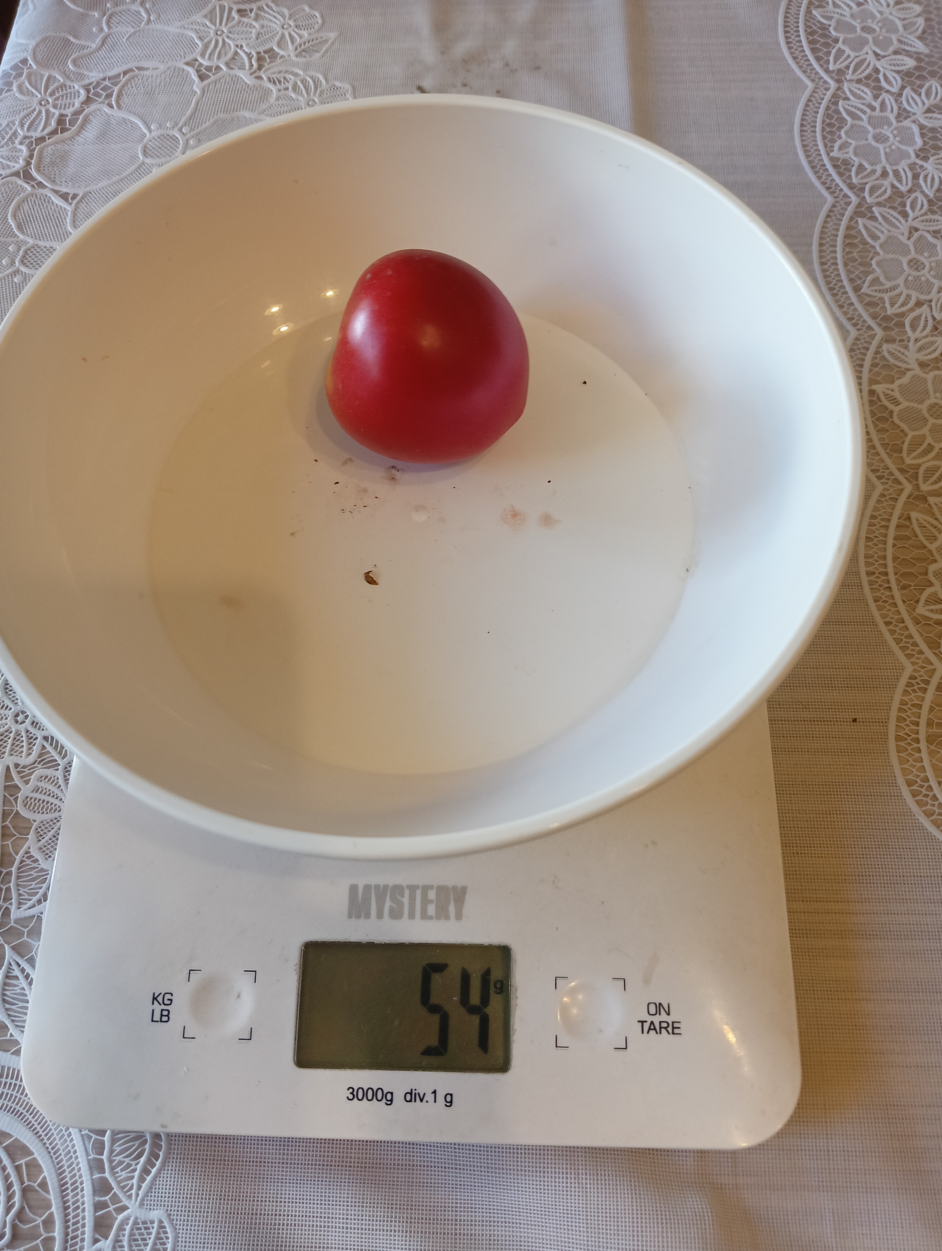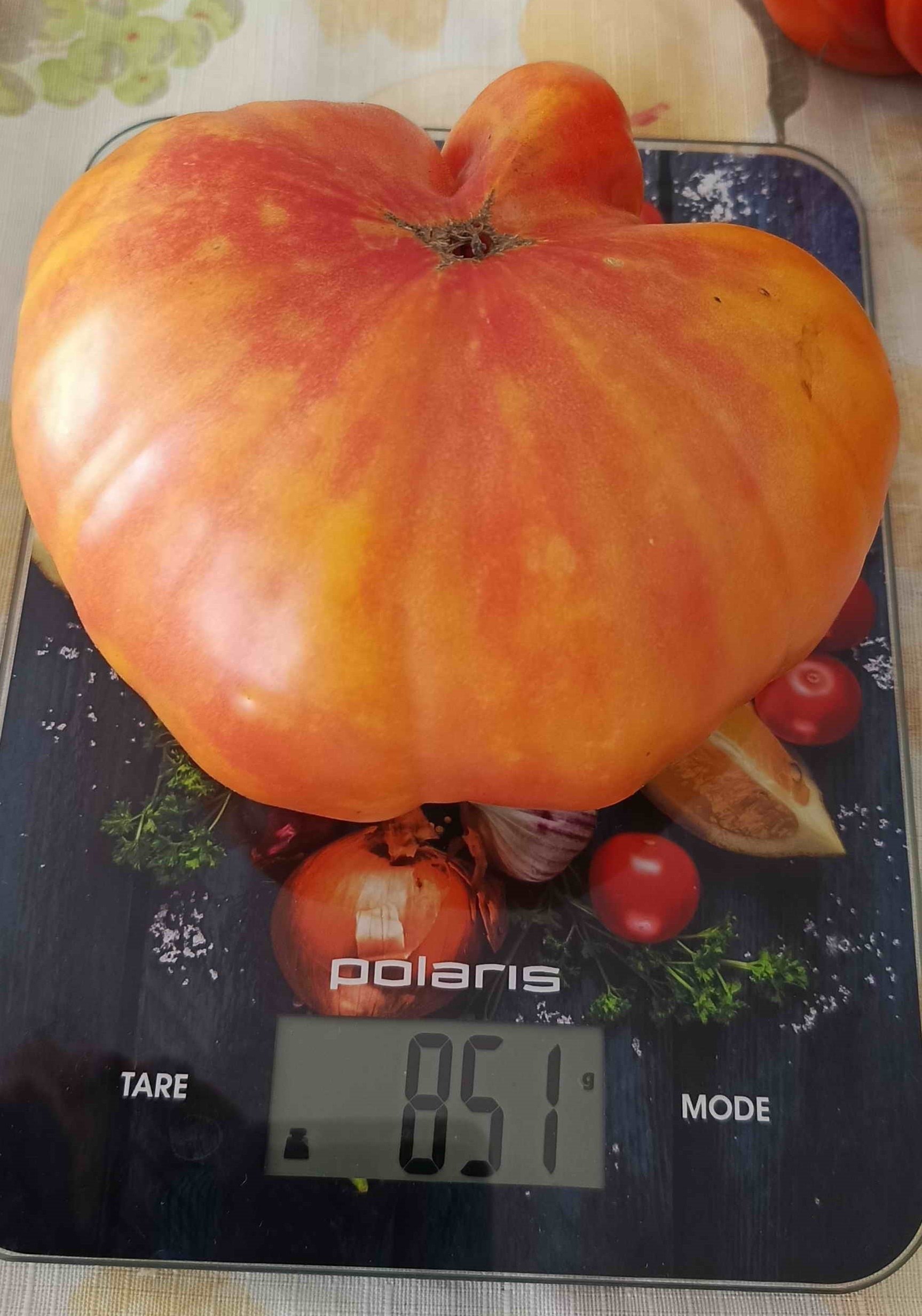 Алтайский богатырь. Первый плод выдал 10 июля, но потом был большой перырыв. Первый плод был и самым вкусным, потом у сорта пошли желтые плечики и сильно трескался. Еще недостаток в жару не вязал. Формировкав один стебель выдала 3 кисти, два пропустила. Формировка в два стебля дала 6 кистей. Плоды крупные, мягкие. Сорт для хорошей агротехники, у нас не очень хорошо показал.