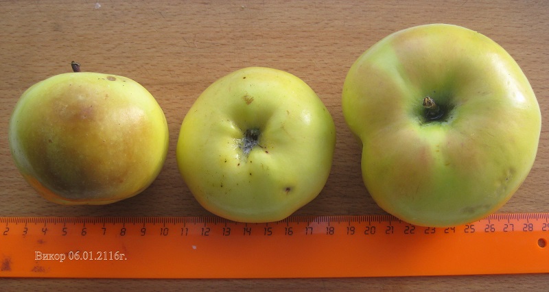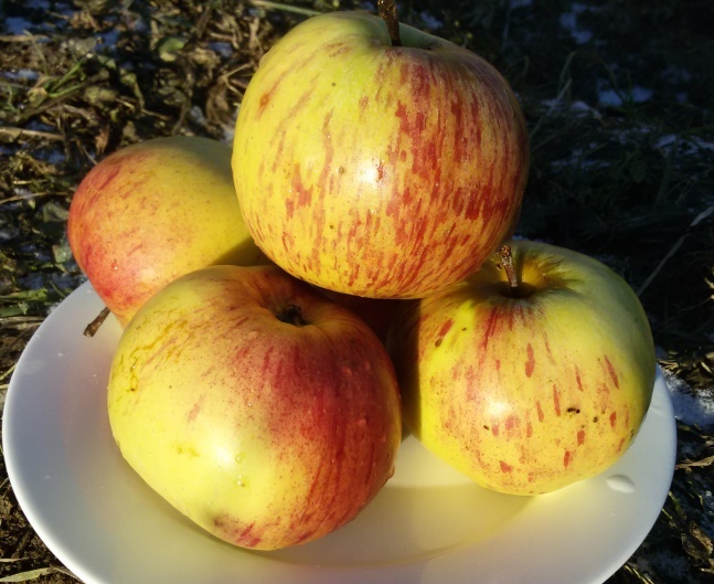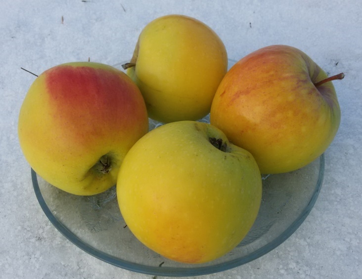 К сожалению, большую часть плодов съели ранее. Но первые впечатления можно сделать. Сорт скорее всего ранне-зимнего срока потребления. На сегодня мякоть уже частично потеряла плотность, но рыхлой ее не назовешь. Очень приятное ощущение при надкусывании – мякоть еще довольно плотная, сочная, мелкозернистая. Вкус кисловато-сладкий, без посторонних привкусов, но на 4,6 или 4,8 балла, что встречается при описании этого сорта вкус явно не дотягивает. Просто хороший десертный вкус. Мякоть плода в отличие от сорта П.Липунова долго не темнеет на срезе. Несколько ухудшает восприятие вкуса очень плотная , достаточно толстая и прочная кожица. На фото виден загар у одного из плодов – это скорее всего результат хранения в полиэтиленовом пакете. Большинство неокрашенных сортов яблок плохо переносят хранение в пакетах и вообще в газовой, регулируемой среде.