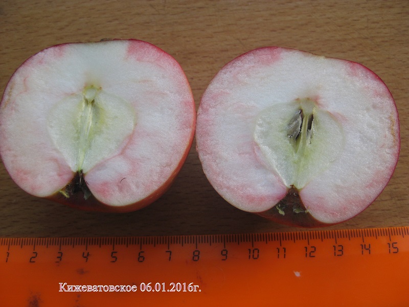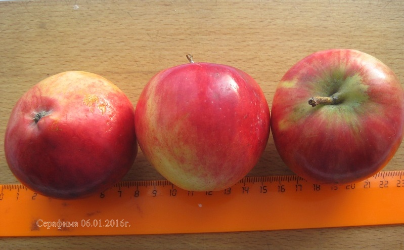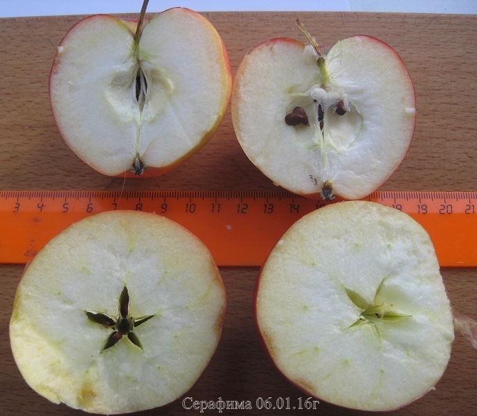 На 6 января 2016г у отдельных плодов сорта Серафима наблюдается легкое потемнение мякоти, что указывает на завершение периода потребления плодов данного сорта. У большей части плодов мякоть стала рыхловатая, но сочность мякоти сохраняется. Плотность мякоти по сравнению с декабрем уменьшилась. Мякоть на срезе долго не темнеет. Вкус еще остается хорошим, кисловато – сладкий, десертный, без посторонних запахов и претензий на исключительность во вкусе. Кожица плодов тонкая, очень плотная, у отдельных плодов наблюдается легкое отделение от мякоти, что также указывает на перезревание плодов в период хранения. По моим наблюдениям сорт в лучшем случае только поздне-осеннего или ранне-зимнего срока потребления.