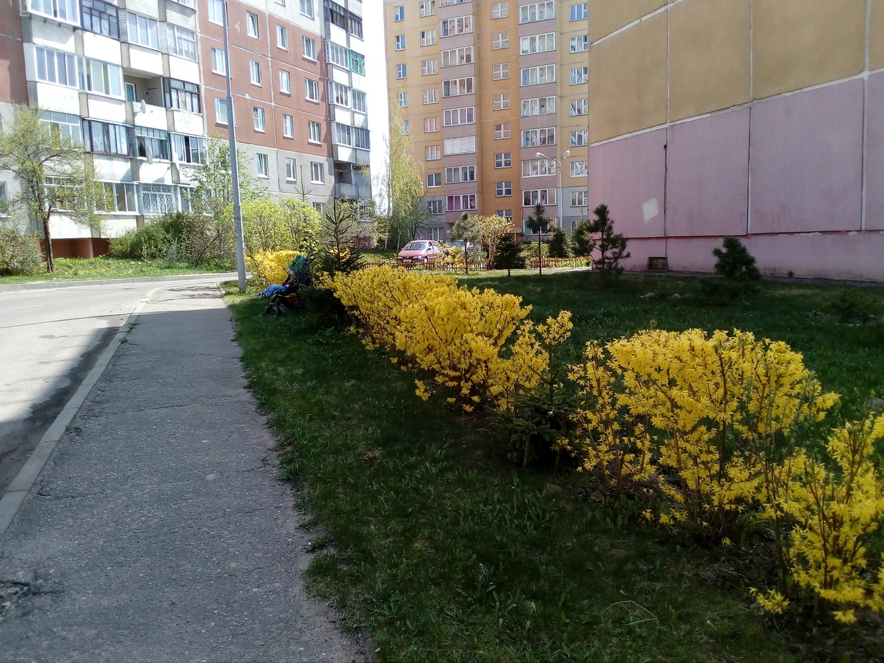 Думала, выкладывала фото с живой изгородью из форзиции, оказалось, что просто казалось... Исправляюсь. Женщина в соседнем доме рискнула. Пишу "рискнула" т.к. у меня на даче зимой форзиция вымерзала по линии снежного покрова.