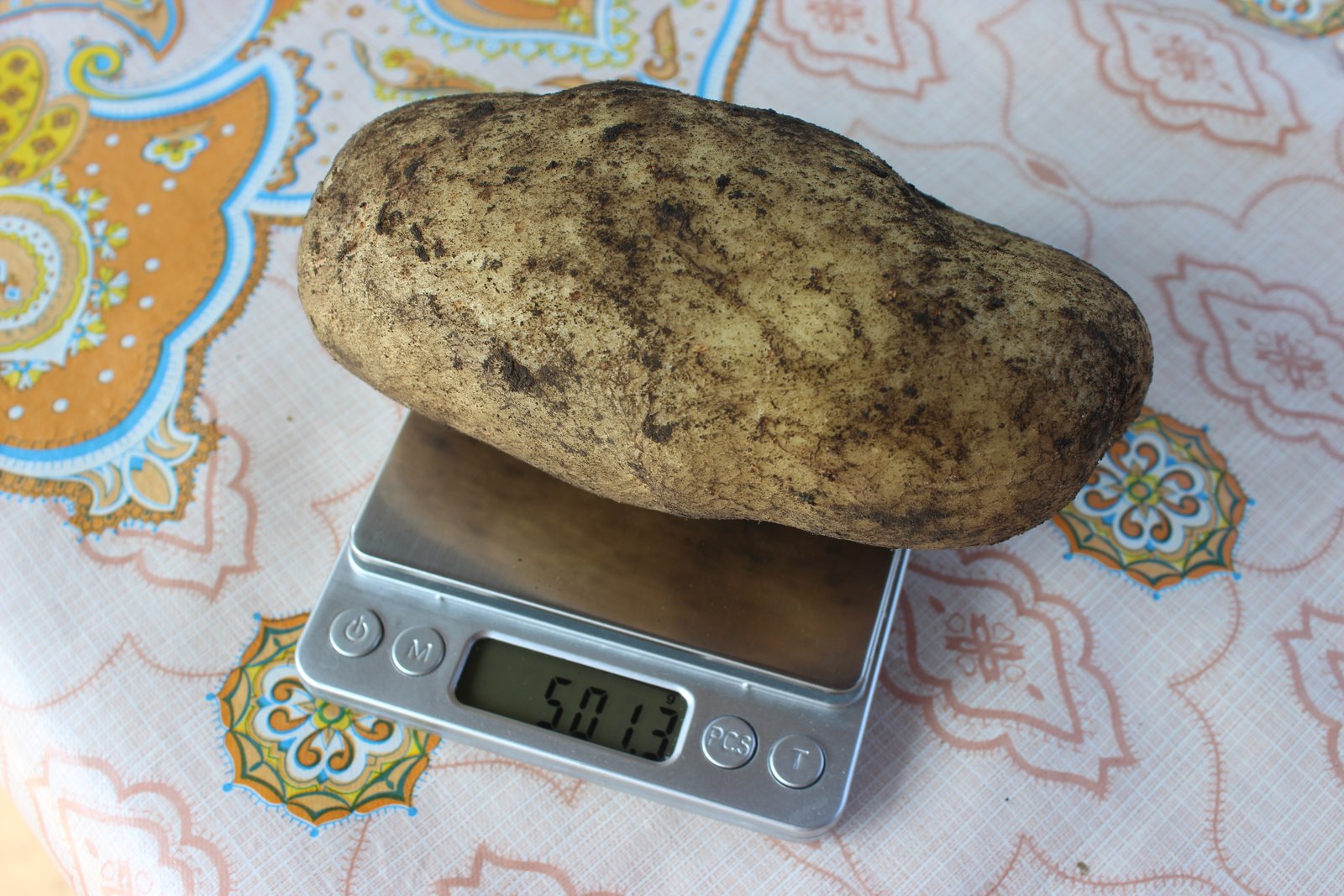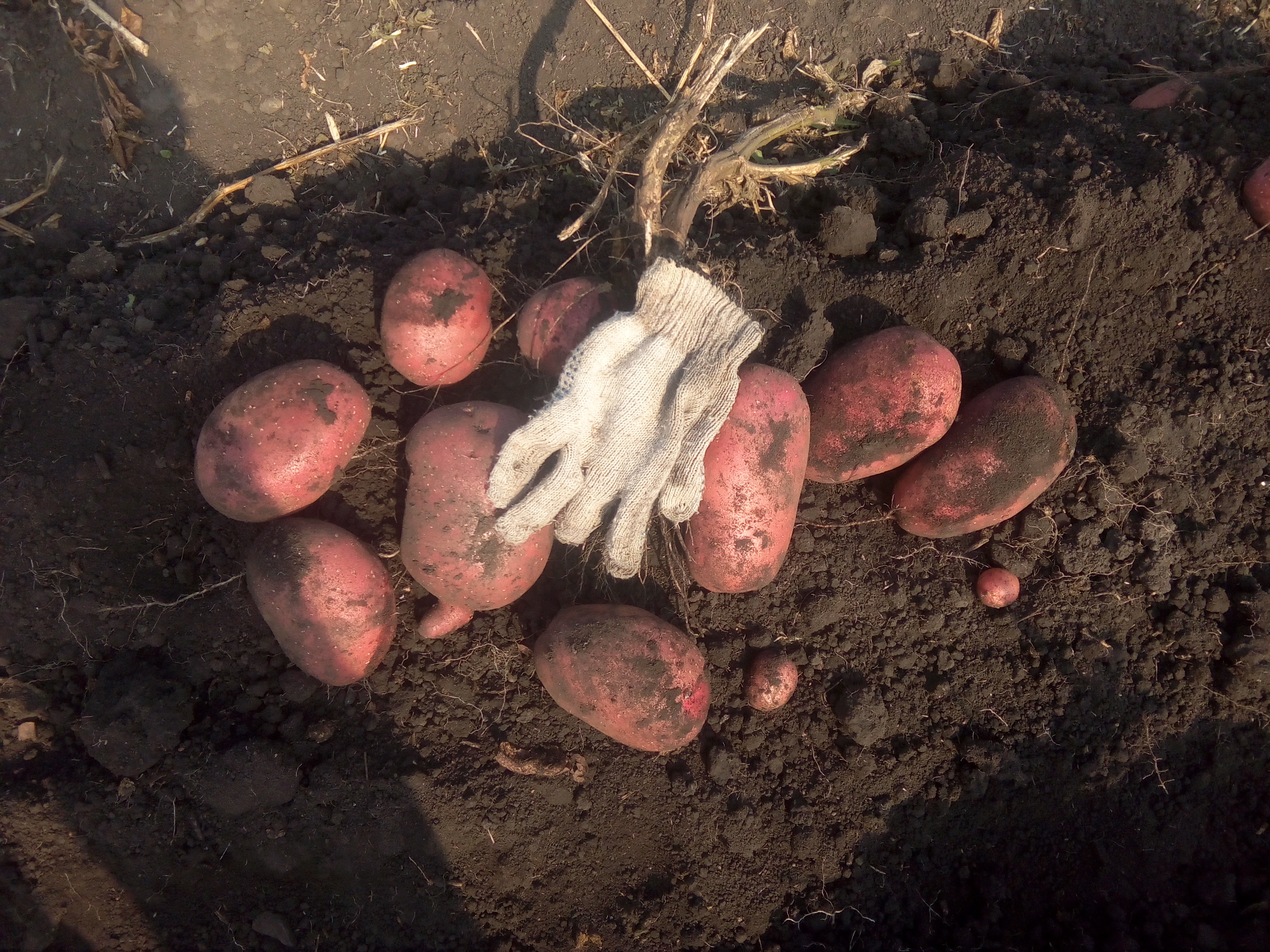 Нынешний сезон задал новые стандарты протоколирования урожая. Спичечный коробок заменен на сигаретную пачку и все больше в моду входят рабочие перчатки. В этом году очень длинные столоны на Гусаре, чего раньше не наблюдалось. Может картофель влагу таким образом искал. Сажаю его через 30 см, в этом году получилось недостаточно. Клубни в основном средние и крупные, откровенных гигантов нет, крупные клубни в районе 500 г. Мне больше и не нужно, все что крупнее уже в руке лежит неудобно.
