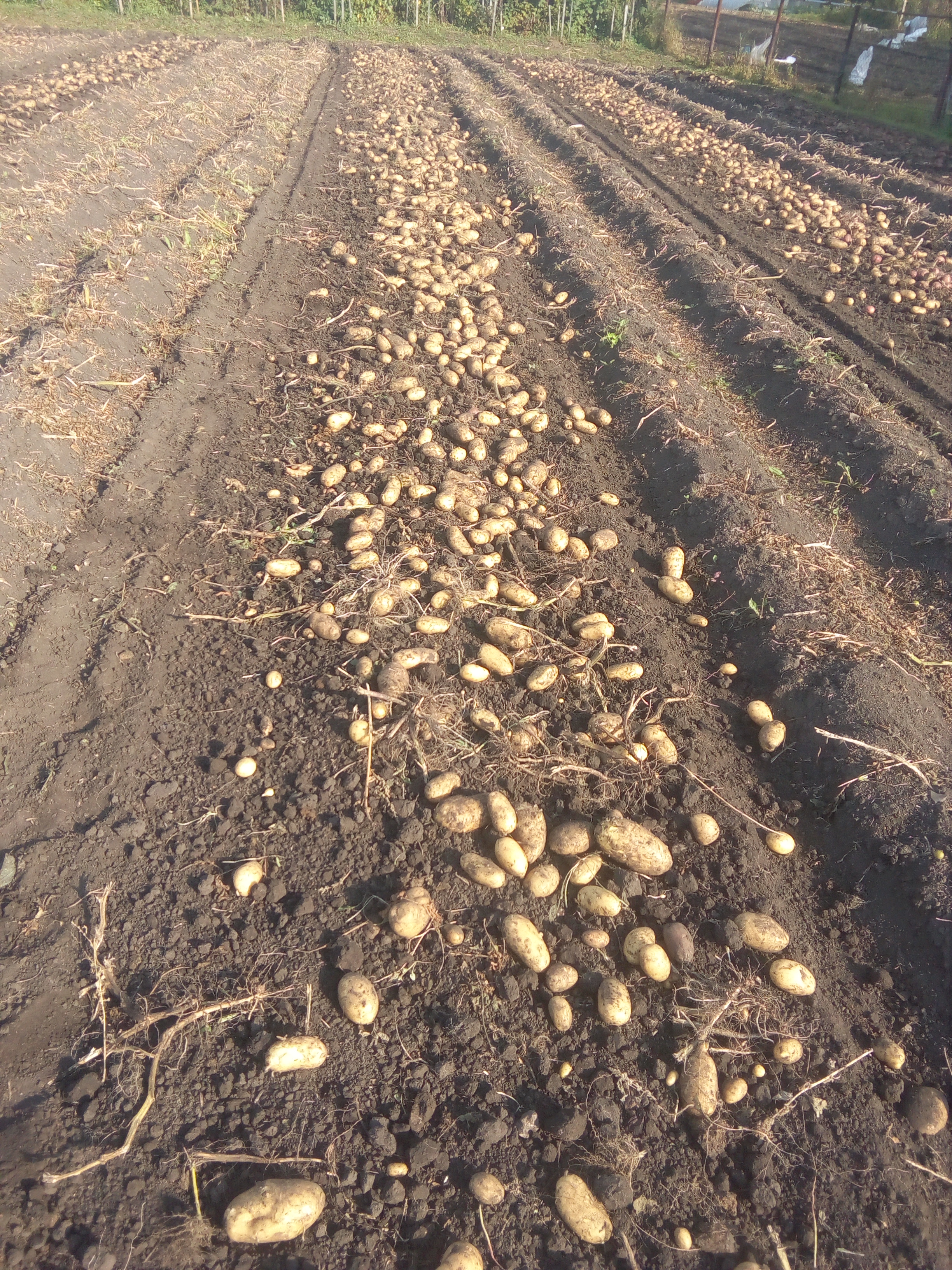 Поле чуть меньше сотки- собрали уже больше 400кг, а 2 ряда еще стоят невыкопанные.