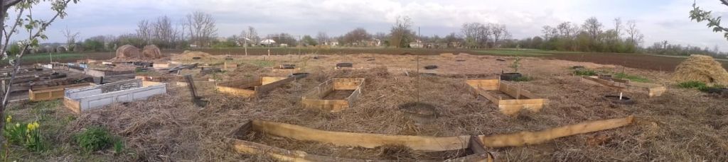 мы засыпали пол огорода соломой, чтобы сохранить влагу с зимы и чтобы трава не росла. Сделали короба (высокие грядки)