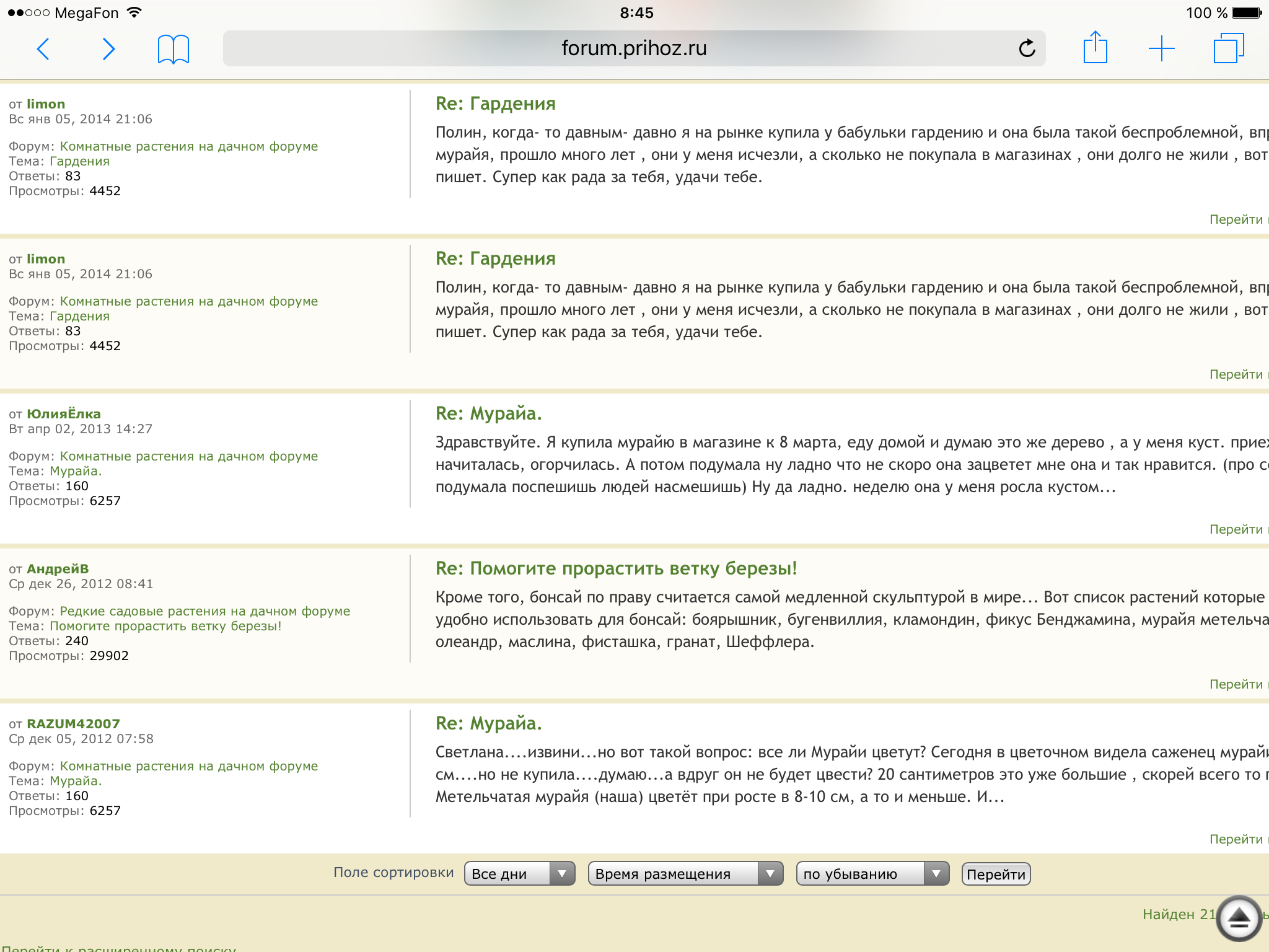 сейчас проверила простым поиском - написала в окне поиска "Мурайя" и нажала на лупу. Итог поиска - 21 результат. Открываю тему и попадаю на первую страницу темы.