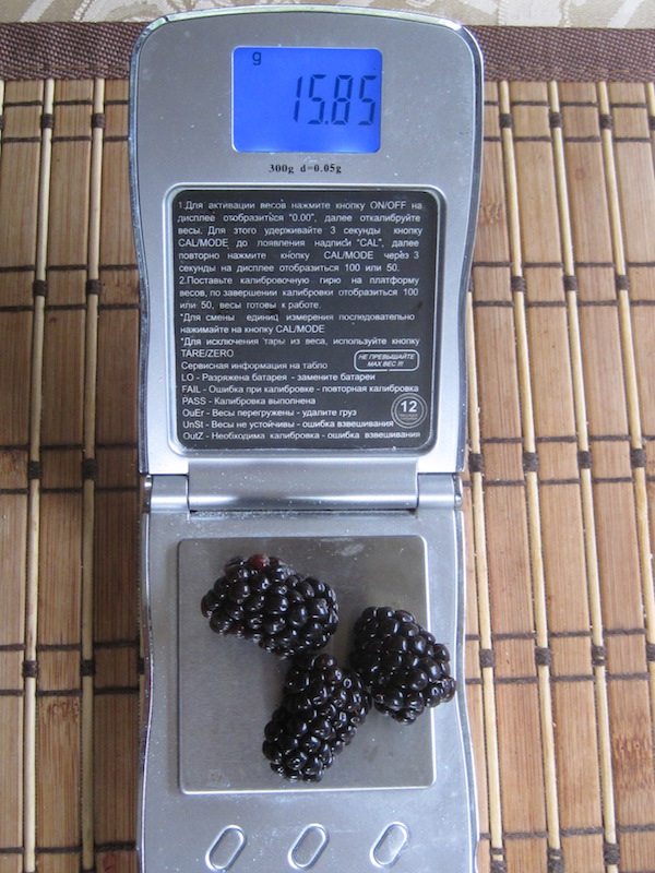 Приходить к таким выводам на основе опыта с бестолковым сортом абсолютно пеправильно. Посадите Лох Тэй, Нэтчез. После этого и делайте выводы. Сбор этих сортов практически закончился. Собрано еще 4кг, всего получилось 40кг за 5 сборов с пяти кустов. ЛТ конечно поурожайнее, но Нэтчез заметно крупнее, такие вот цилиндрики (правда не все такие)!